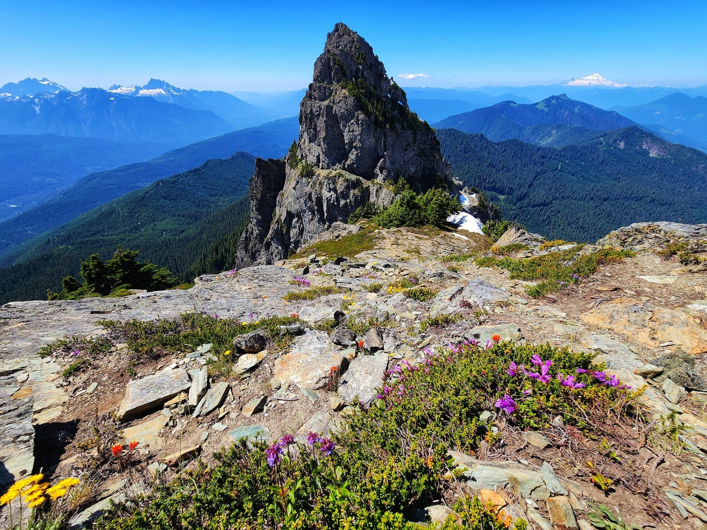 While the slabs are not overly difficult and approximately class III scrambling, they are extremely slick when wet and a fall or slide down them would have decidedly serious consequences. After the traverse, you meet up with climbers trail and in combination with the rock cairns will find your way heading right towards the "notch" where you will descend 15-20 ft carefully into the saddle. It's here that prominence of White Chuck can be observed with the steep drop-offs on both sides, Thornton Lake below and the true summit up above. A final push up somewhat exposed slabs and booth paths will grant you the summit along with the summit registry in a Brass "Mountaineers" capsule.