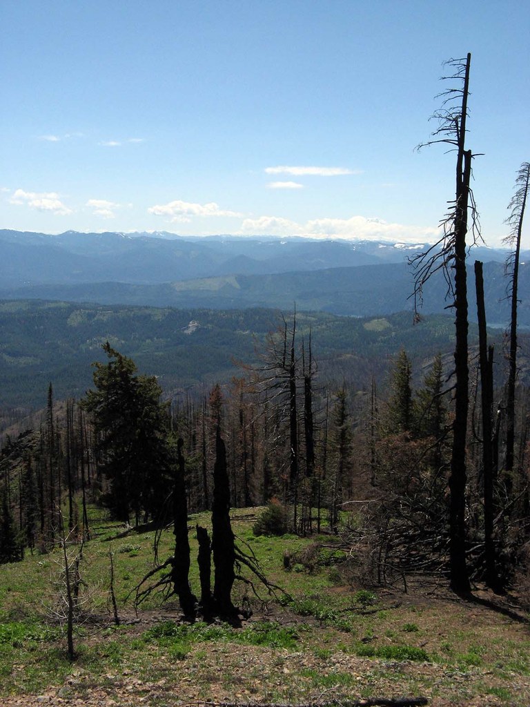The multi-user, somewhat eroded, Yellow Hill trail provides access to Yellow Hill and its views to the south. The 2017 Jolly Mountain Fire changed this from a shaded hike to a hot climb through a stark silver and black forest with a stunning understory of flowers. Spring is the best time for flowers, views, and stillness. Avoid mid/late summer with the oppressive heat & motorcycles and be sure to wear orange in the fall with hunters.