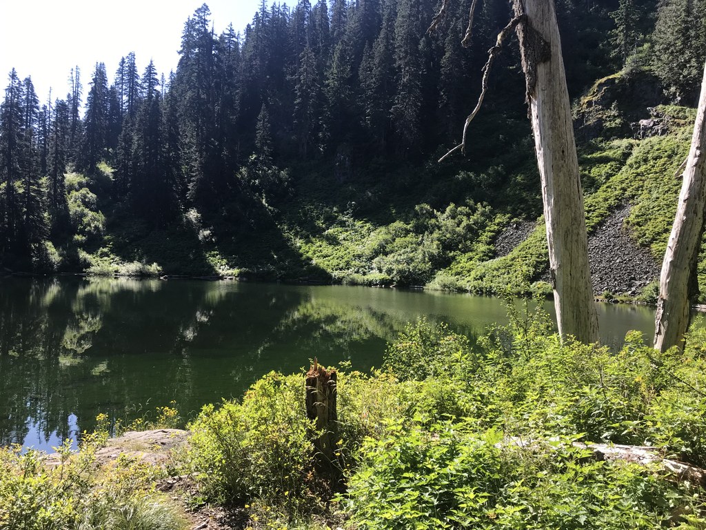 Set at the bottom of a cirque, this tarn is the remnant of a retreating glacier. The surrounding forest is filled with mature Douglas-fir and hemlock, as well as scattered old-growth giants hanging on to the steep hillside.