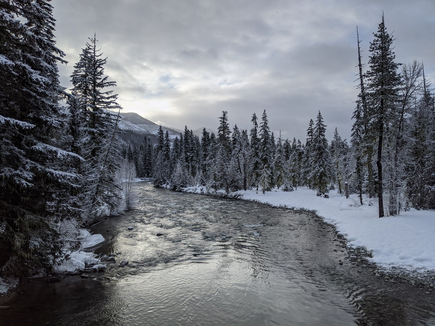 We parked near the Salmon La Sac Rd road's end turnaround and put on our snowshoes at the split for Cle Elum Valley Rd (NF-4330) taking the left over the Cle Elum River bridge then past the Salmon La Sac campground to the Cooper River trail. Thin crust over powder makes for very slow going. We postholed approximating the Cooper River Trail only about a third of the way to Cooper Lake taking 2 hours, before stopping for lunch, turning around and making faster progress back along our earlier track. GAIA app was invaluable as always.