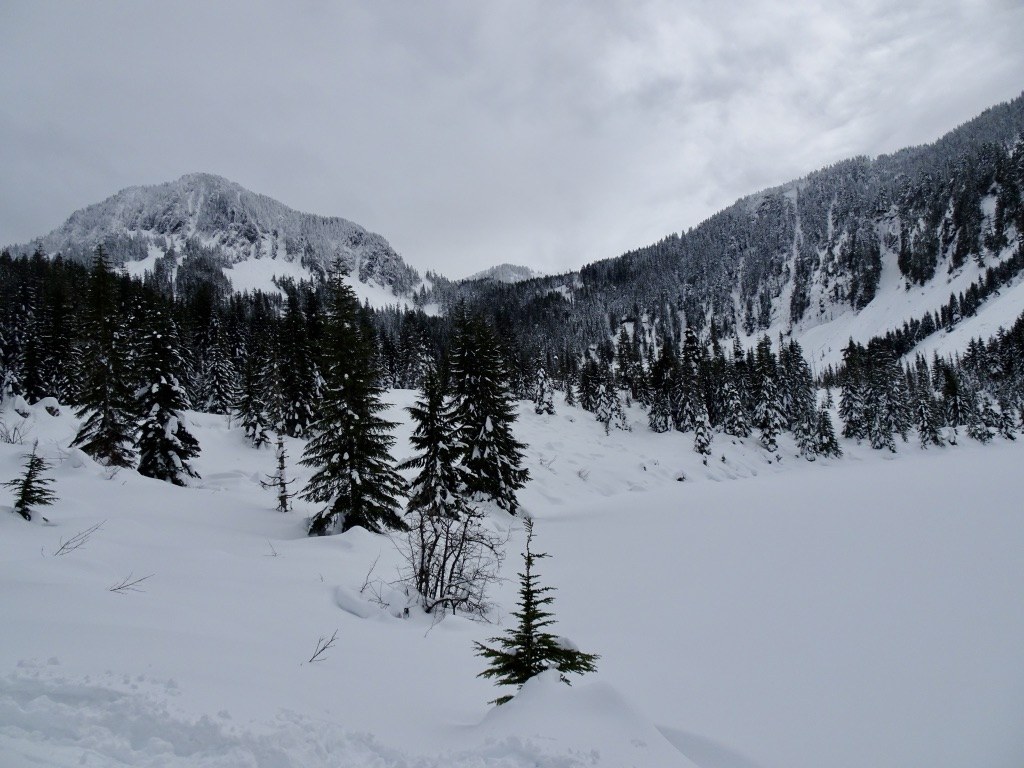 At ~2600 ft (where an old road goes right down to the creek) we stayed left but were soon stopped by a long stretch of totally snow-bent trees. Rather than fight through them along the usual summer trail, we detoured to the lower, old logging road (not shown on Green Trails or the TH map) down to the creek, and then headed straight up the creek to the lower lake for lunch. Until the trees on the upper trail lose their snow this is probably the easier way. Some tricky creek troughs to cross through, and trail breaking as well to the lower lake.