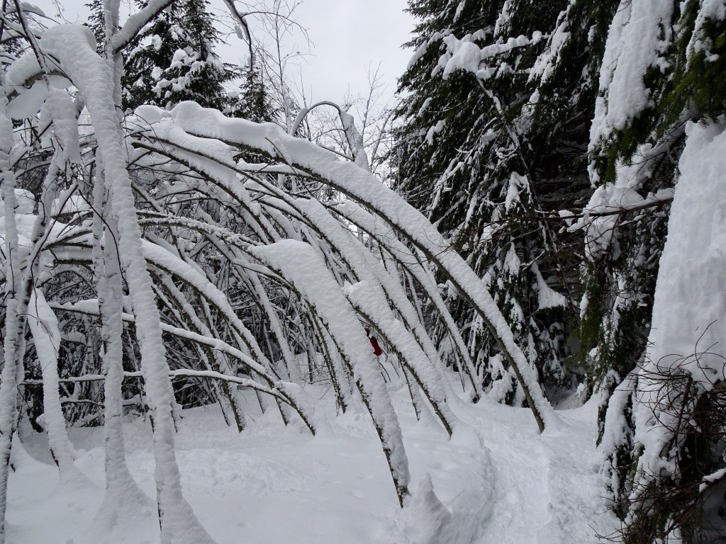 Farther up as the snow got deeper we were slowed down by various low hanging trees pushed down over the trail, necessitating detours or knocking snow off.