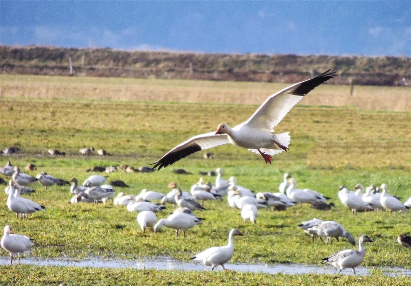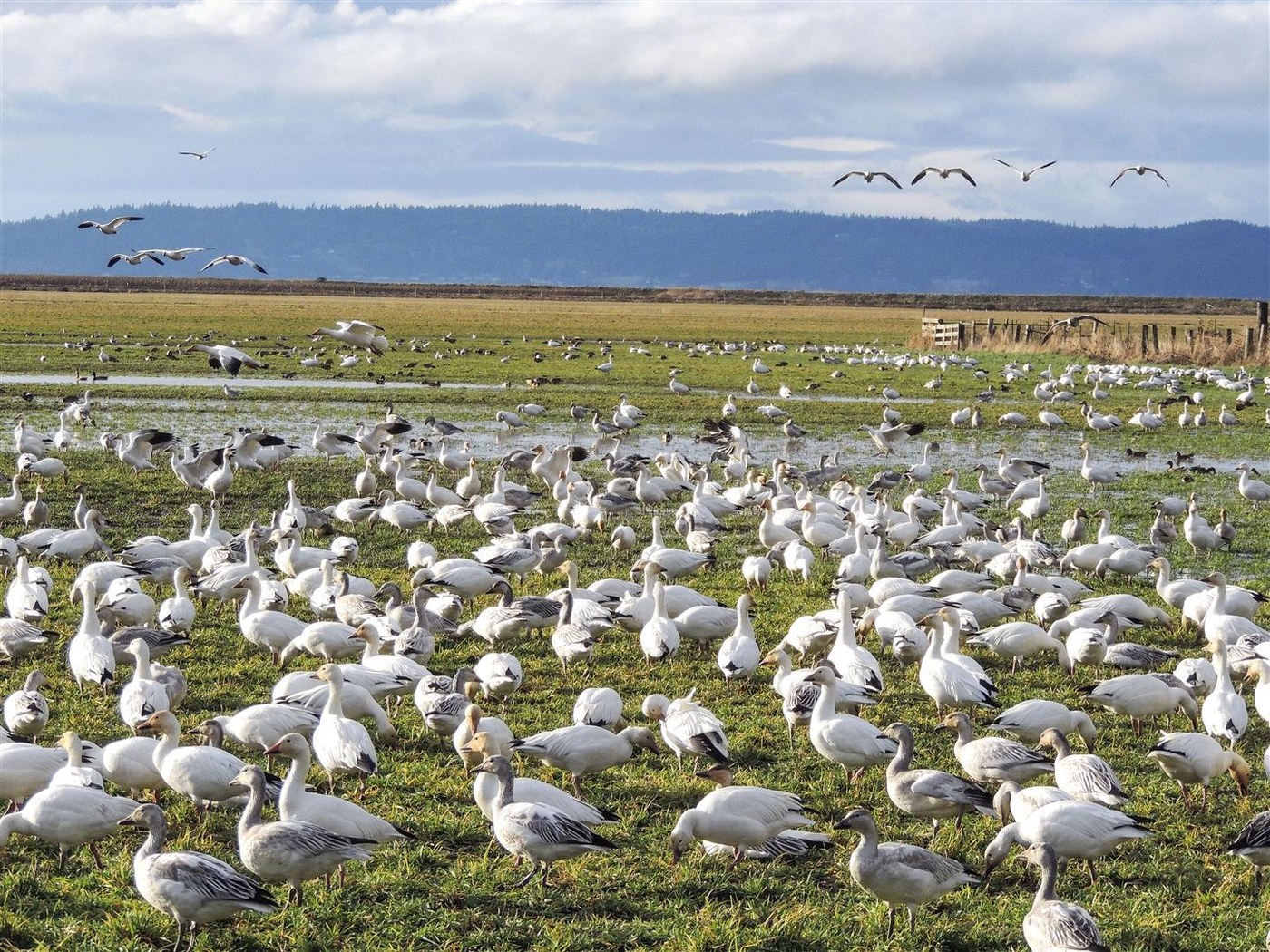 There was finally a sun break north of Stanwood this afternoon. I found Tundra Swans and Snow Geese. It was great to feel the sun. The geese were closer than the swans, so I chose to include pictures of the geese.