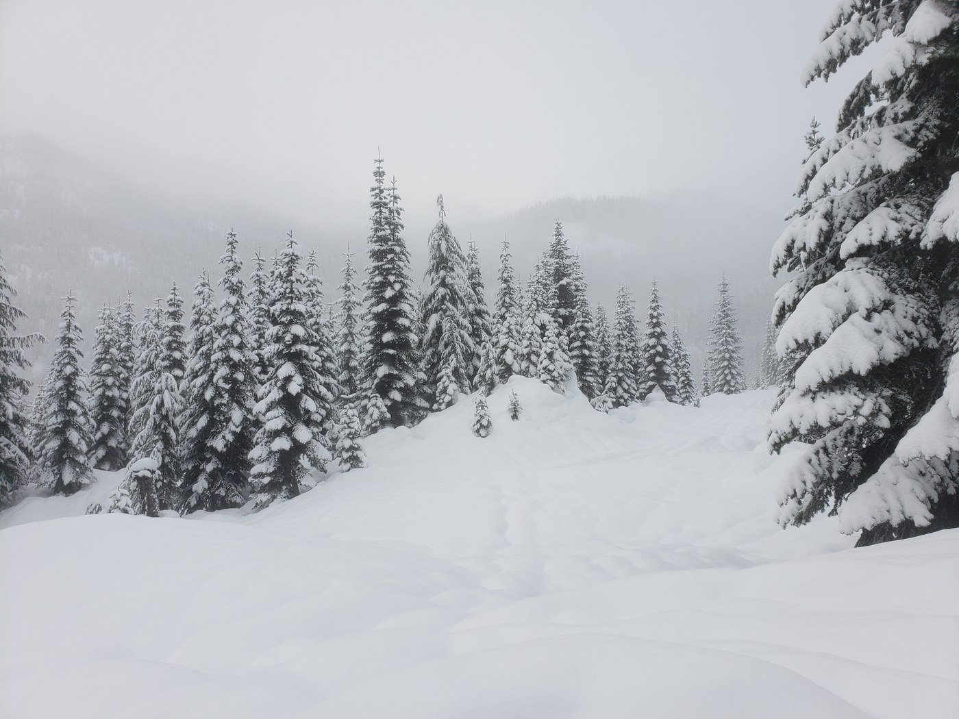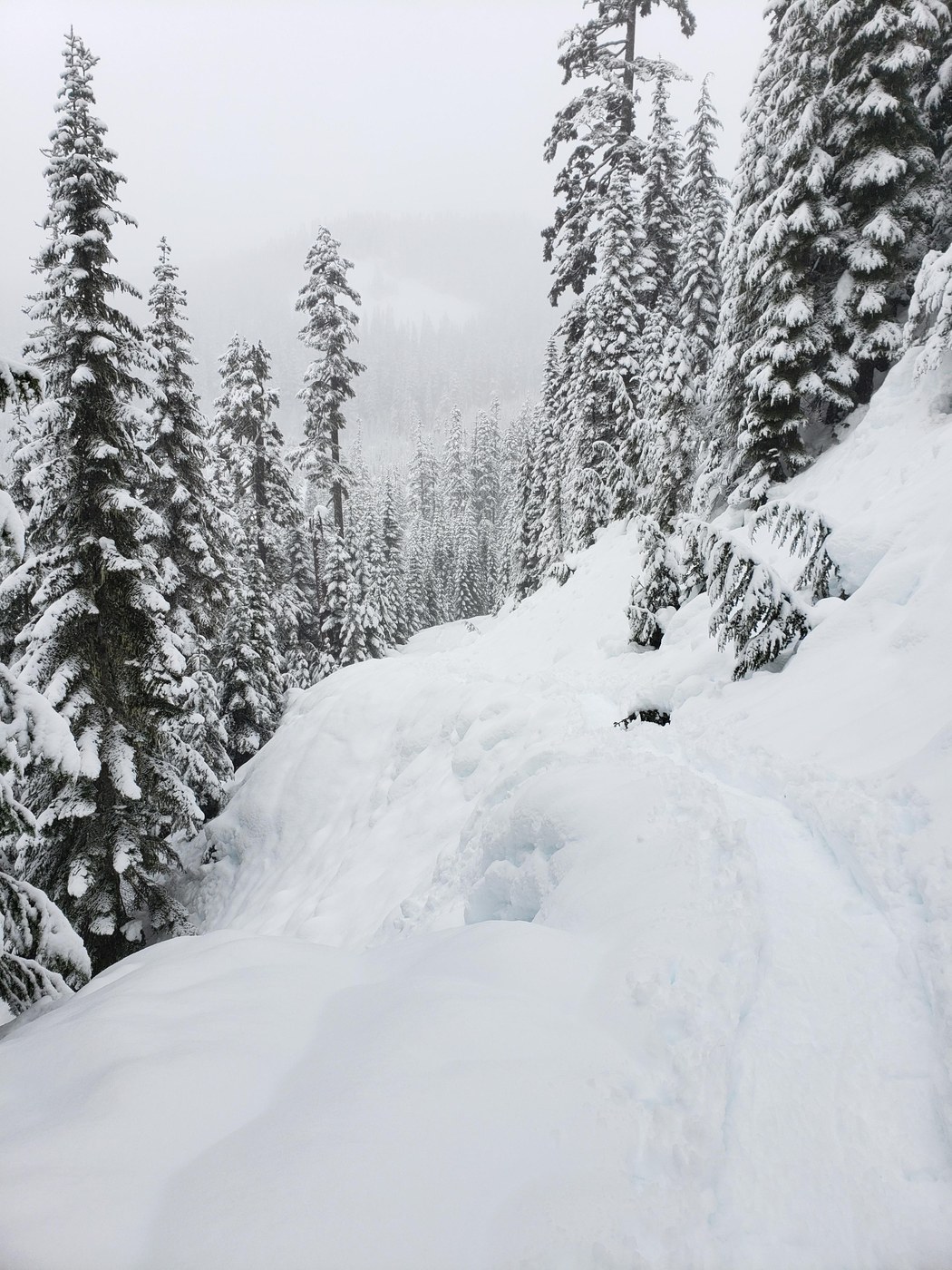 We arrived at the trailhead on a Saturday morning around 9:15 am? And there were already quite a few cars parked all along the road (as expected) for a weekend at this popular location. Whence we started out on the trail however, we didn't see too many people. Apparently they were all heading over to the Gold Creek Pond trails. We hiked the first two and a half miles or so in our microspikes, and then we started postholing up to our knees, so we decided to put on our snowshoes at that point. We continued up to the large clearing about 4 1/2 miles in, and we were informed by another hiker that the lake was not safe to access due to the recent heavy snowfall, and the steep slope down to it. Since we decided we were not interested in breaking new trail, we turned around at this point, and headed back down. As we reached the parking lot, the clouds began to break up and we were able to see the sun peeking out.