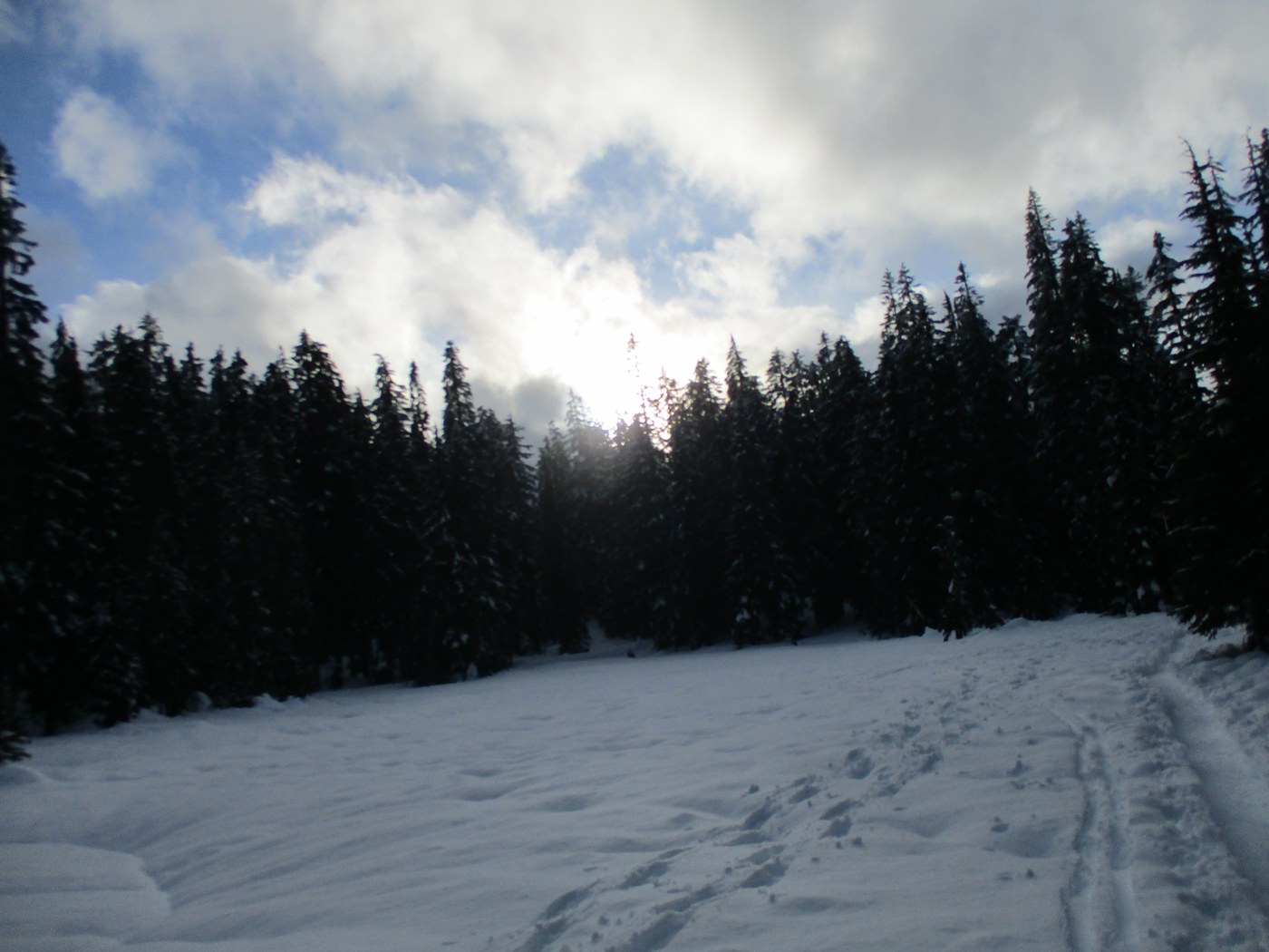 HYAK LAKE TRAIL. The trail starts behind the left side of Silver Firs Lodge (green dumpster) and twists up immediately into the forest. Shortly join a ski trail. Go left past a snow covered bridge (watch out for the downhill/cross country & boarders traffic) until the junction with the designating yellow symbol [only for snowshoeing]. It starts gradually steep with 680-ft elev. gain on mostly packed trail in-and-out of the treeline. Trail recrosses the ski trail and continues up to the lake loop area. Be careful not to venture into directions where there are no snowshoe tracks. Easy to sink a few feet deep, also quite difficult to pull back out. Lake level is a vast open view area good place to rest.