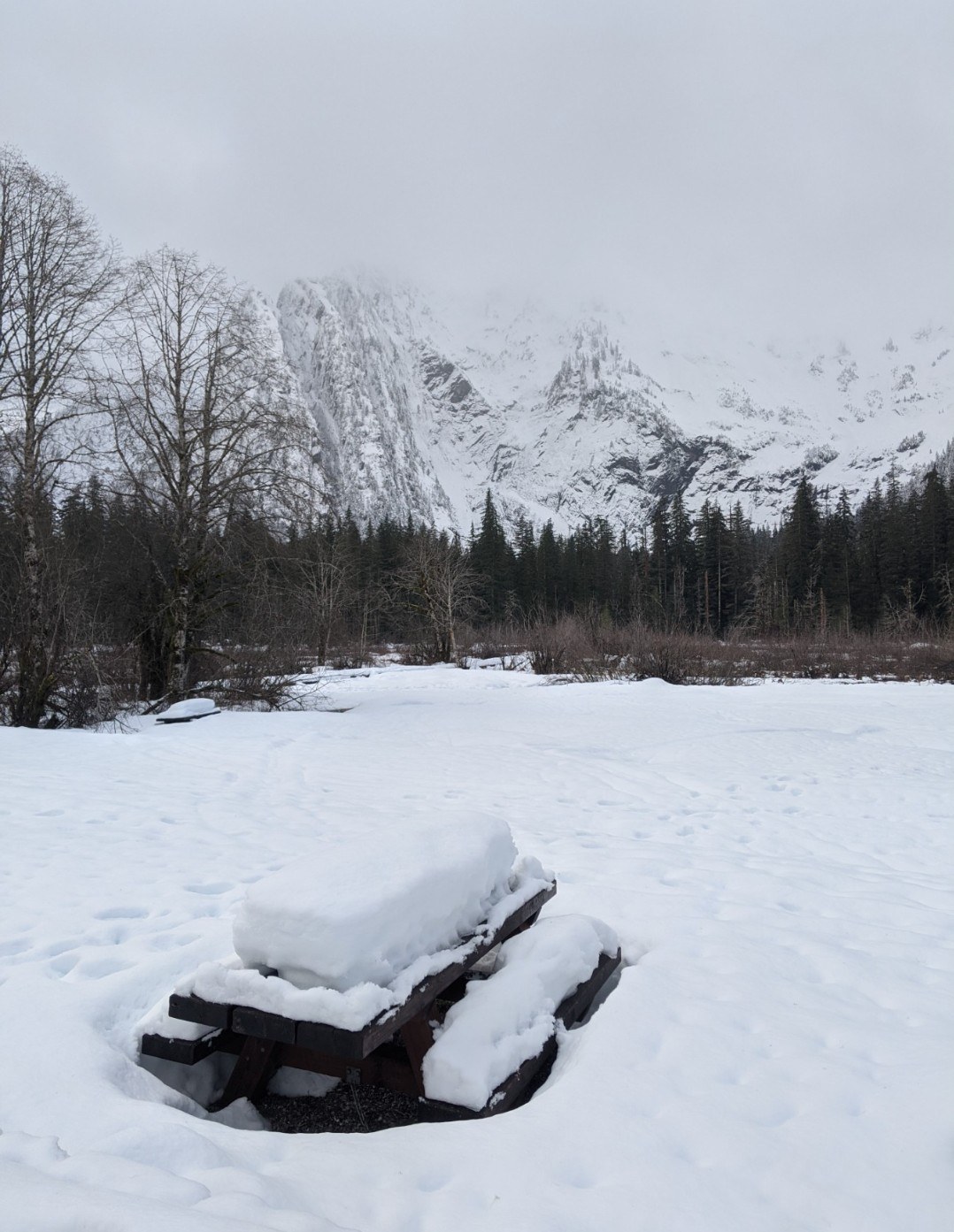 The last 2 miles of highway before the gate at deer creek was covered in a light layer of slush but wouldn't pose a problem for any vehicles. There was enough snow past the gate that snowshoes or xc skis would be useful but there's a solid footpath thru the snow, you could use gaiters & boots too. Big Four is a beautiful mountain even without the ice caves this time of year. Unfortunately it was mostly covered by clouds today. Part of the bridge over the river is gone so you can't enter the avalanche zone at the base of the mountain. Snowed on & off, a little breezy at times but lovely quiet winter wonderland today!