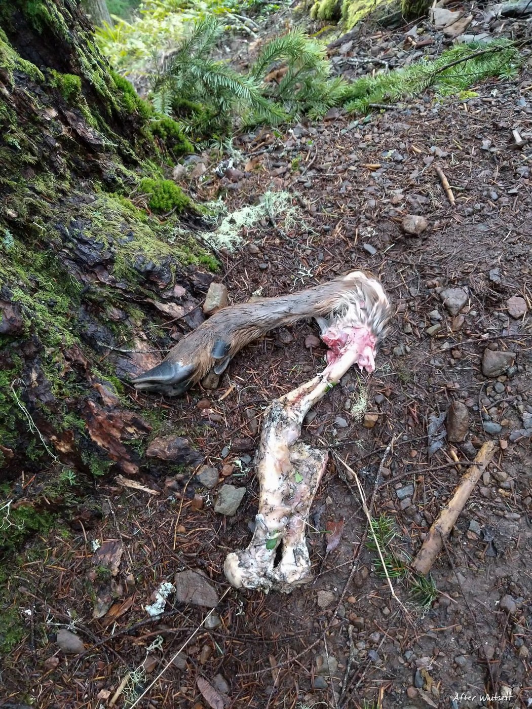 I talked to a person who works with cougars. They don't leave stuff like that. That leg has been dead for a long time. Cougars don't move their kills. It's most likely a large bird or something else.