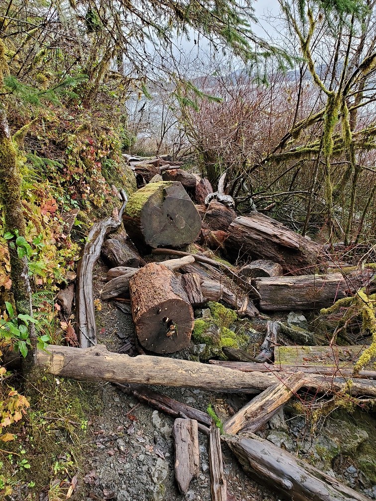 The section of trail along the lake is littered with driftwood. I'm assuming recent flooding carried all of the driftwood in, and then as the lake water receded, deposited it all on the trail. There's more obstacle than trail in many spots. It was all wet and slippery too, so really slowed me down to get through. In some places it was hard to know if I was still even on the trail.