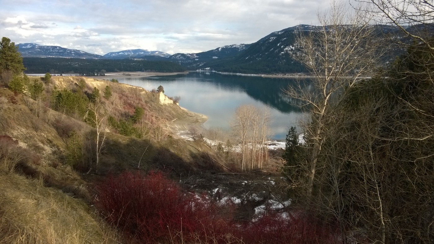 Take a left on the green trail, and walk along the top of the bluff, with a field and good views of the Huckleberry subrange of the Selkirks to the east and south. At this point and south a lot of places have been badly eroded, so be careful not to get too close to the edge. Follow this wide path as it gradually loops left, keeping left to descend northeast to the end of the point where there is a breezy picnic table with excellent views.