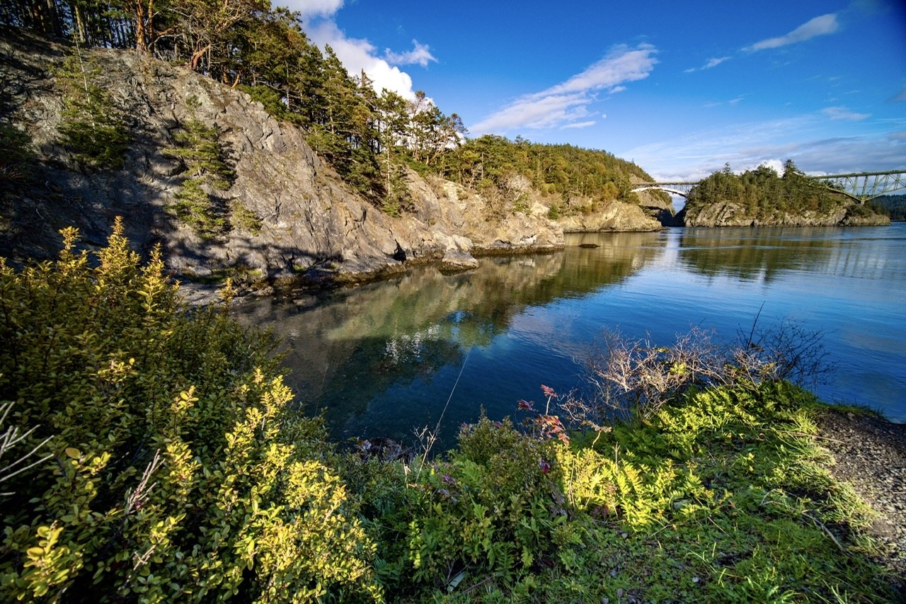 When facing the water, head left, to start the trail. Cross a wooden bridge and begin this easy but epic journey exploring several coves. Soon after the bridge the trail goes up into the forest with some peekaboo views. Then it quickly descends down to two coves. Another picturesque view right at the start. Then the trail enters back into the forest and there is another epic cove spot with Deception Pass Bridge in view. Continue through the forest and then the trail opens up to more coves with stunning views. This hike wins with amazing views and little work. So fun to explore all the coves. I lost count on how many coves there were. We went clockwise on the loop trail.