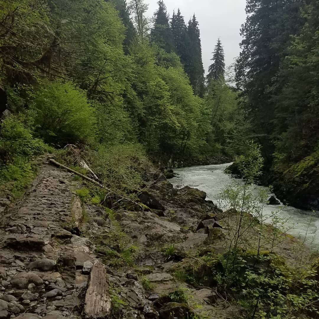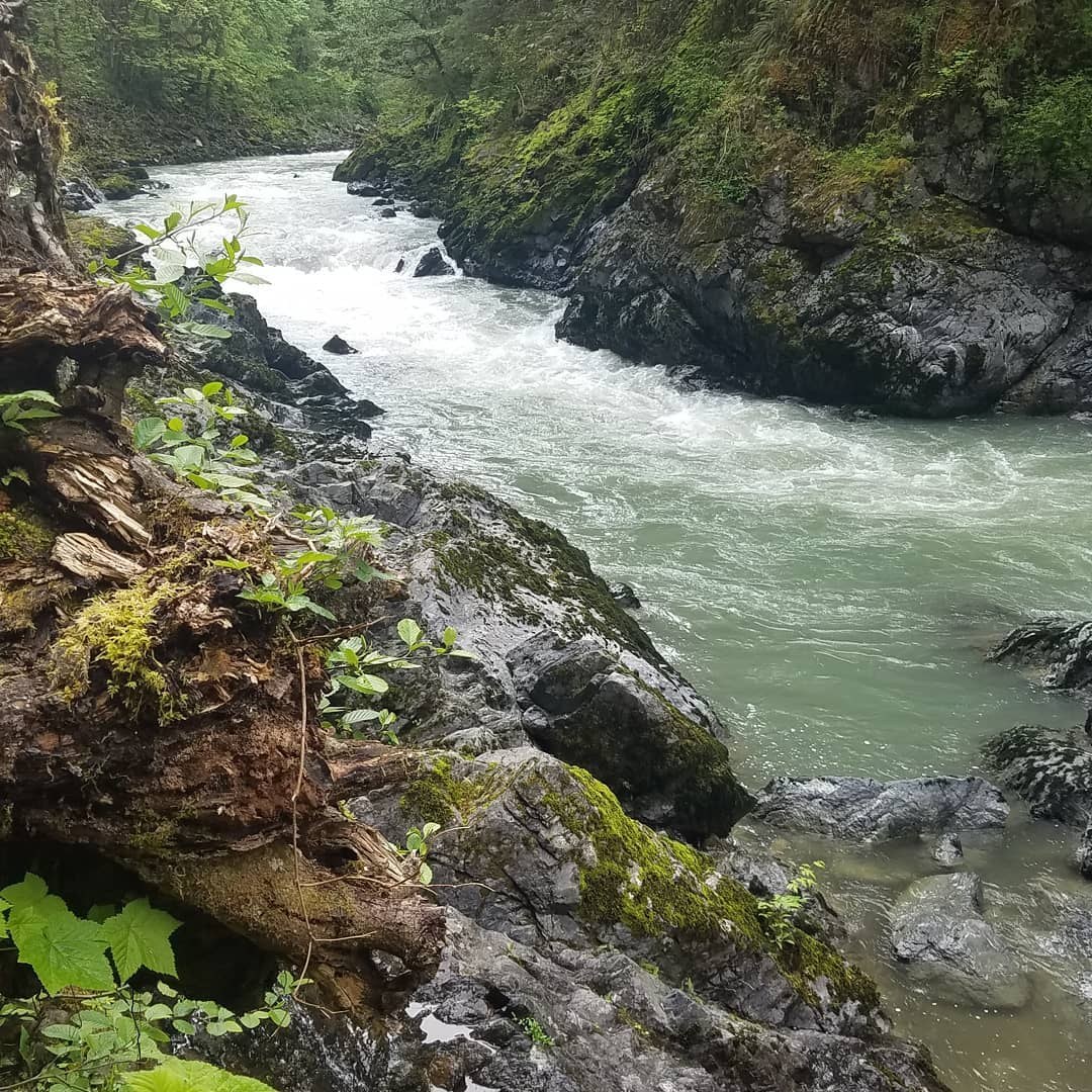 The trail makes a long, easy "U" around the marsh, through old growth and new nurse logs, and you suddenly find yourself at the river. Right away, there are places to sit and enjoy. Continue along and you will start needing to clamber over some low longs and under some slightly higher ones. You also start to see the signs of the railroad - ancient ties and pins in the ground and concrete structures. Very cool.