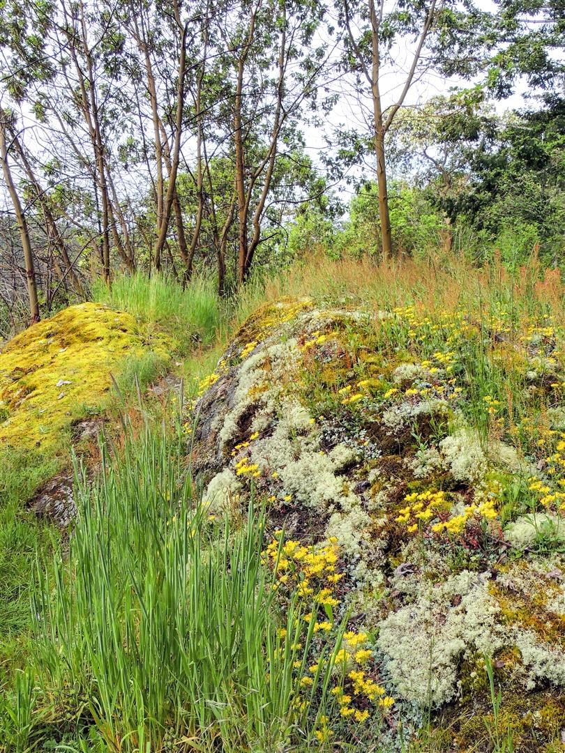 Encounter a section with huge clusters of wild roses and other wildflowers bracketing the trail. There is a side trail there that leads up about 75' through an open area of moss covered rocks.