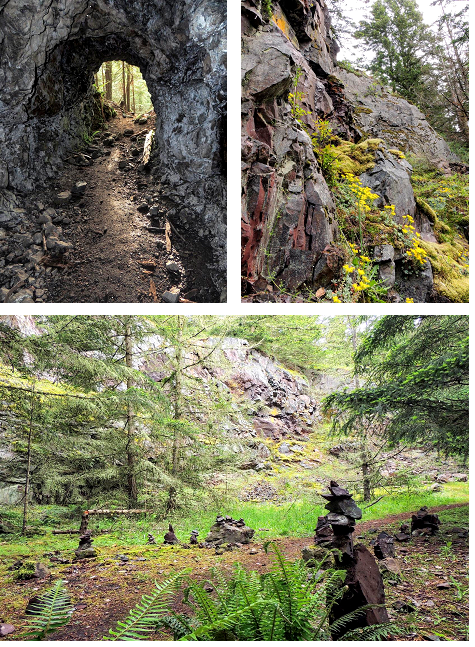 The small signed parking area is at the junction of Campbell Lake, Sharpe, and Donnell Roads. Enter from Campbell Lake road. No pass needed. Walk 0.45 mile down Donnell Road (no parking on that road) and find the signed TH on the right. Begin with a moderate ascent (300' in 1/3 mile). The way then undulates up and down. View the obvious mine on the right followed by the old cabin just below the mine.