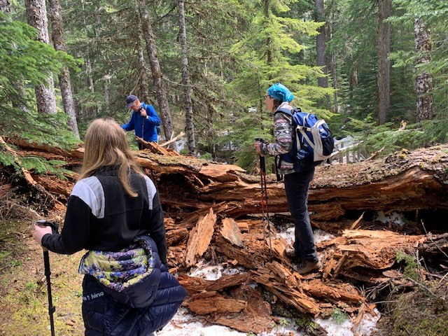 Despite the snow and downed trees, we had a fabulous time. The forest was beautiful and just waking from its winter slumber. There is every shade of green bursting from the remnants of last autumn's duff. The standout flowers were trillium and the calypso orchids, which we rarely see. There are multiple waterfalls that are thundering with spring glacial melt. All bridges were in place, and several major ones appeared new. And as noted, we had the forest to ourselves for most of the hike, so it was a great choice for social distancing.