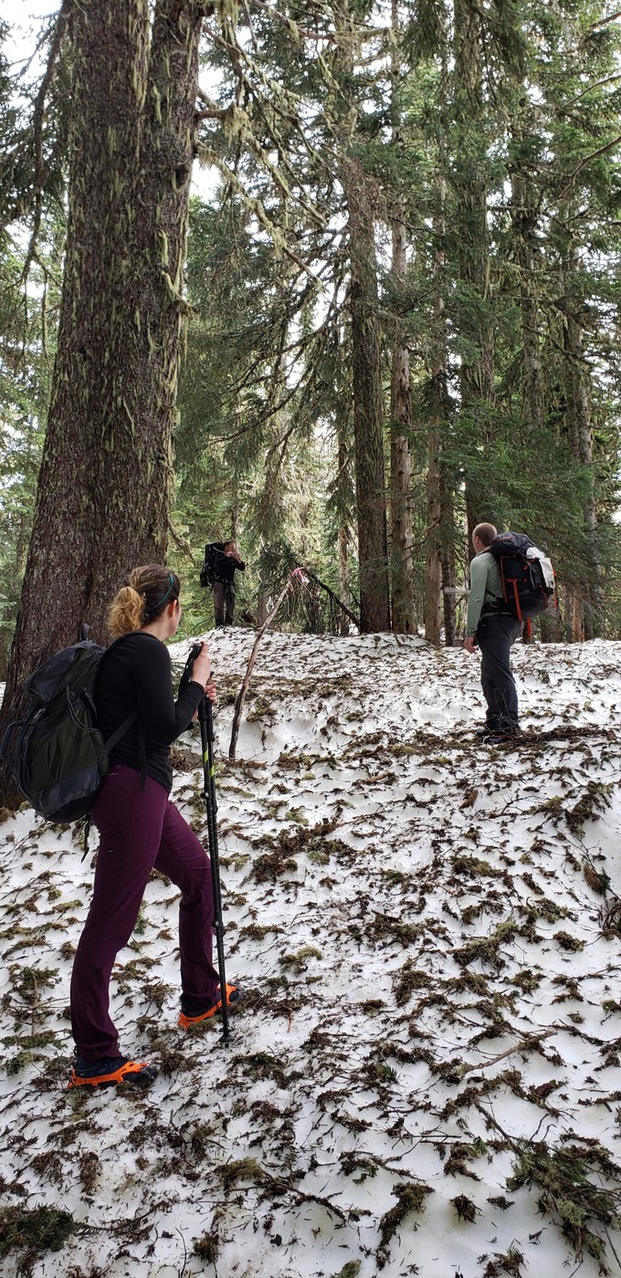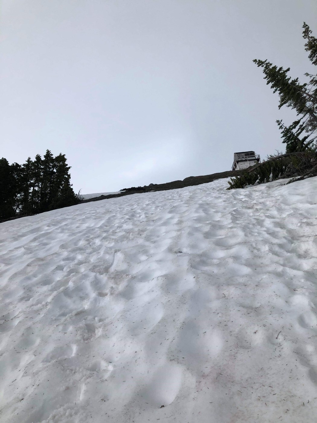 The trail is mostly covered in deep slushy snow. Our group did fine with micro spikes and poles. We brought ice axes for final push on steep snow fields, but poles would be sufficient.