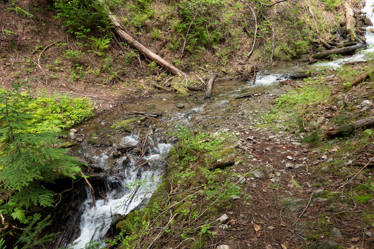 Headed ~3mi up the trail to the junction with the Rock Creek Tie trail. The first mile or so was slightly overgrown. Crossed three small streams with dry feet, and stepped over (or ducked under) a dozen or so good-sized blowdowns. There was a short section about 1.5mi in where the trail was narrow with steep drop-offs, culminating in a washout that had been bridged, but had since filled up partially with loose rocks and dirt. Falling off the trail here looked fatal; fortunately everything felt stable. A shovel would have been useful.
