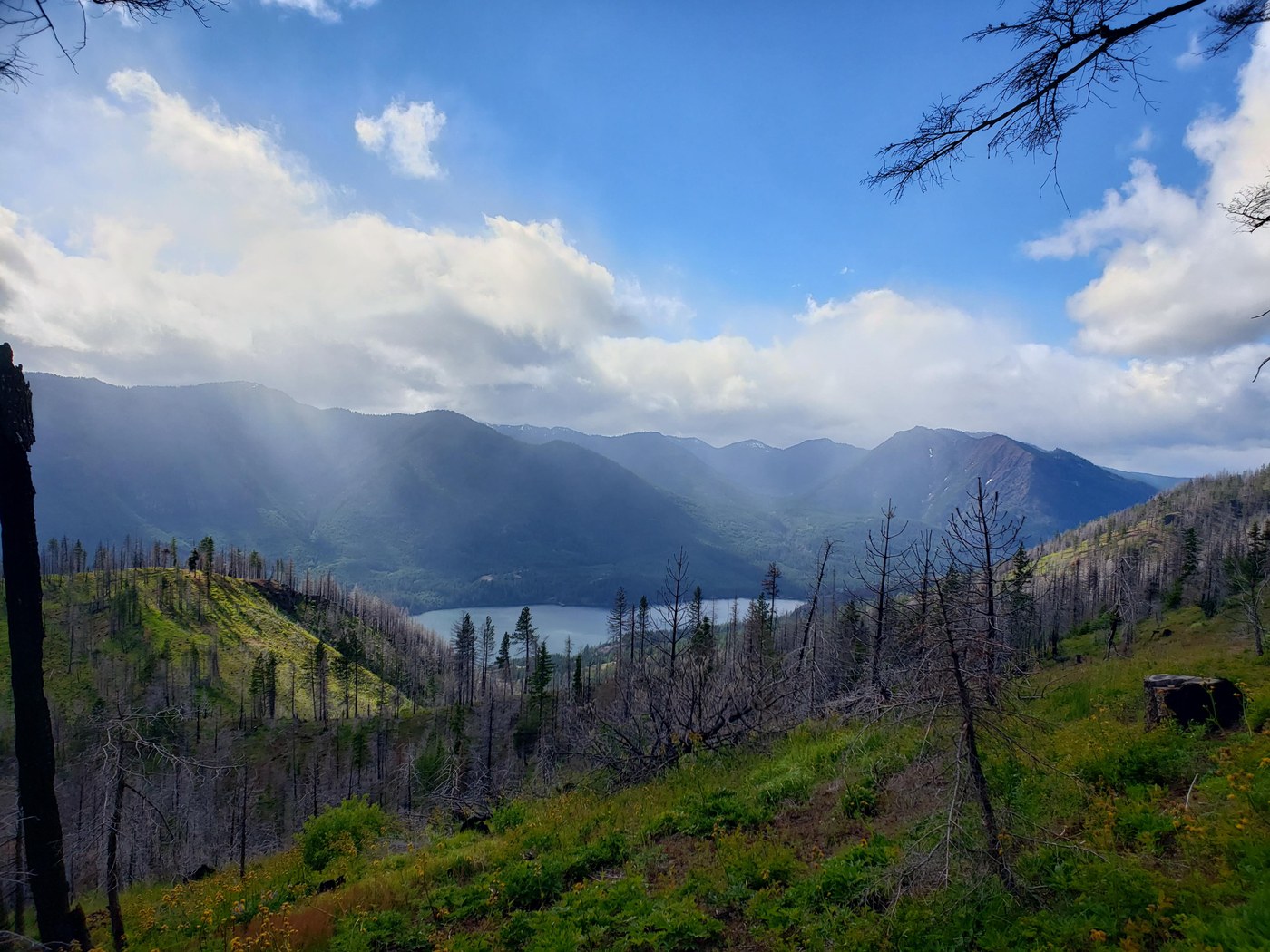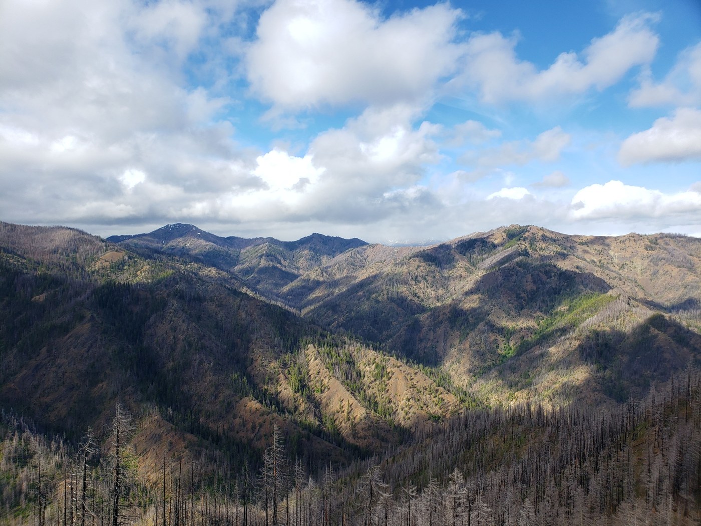 I also decided to take the other ridge line down, following mostly the Sasse Mountain trail. It would be easy to get lost here without a GPS, but basically you need to follow the winding dirt tracks (some of those tracks are not on any map) way down until when, in the forest off the upper part of the mountain, you drop out onto a forest road (FR4305 112). You will actually hit that road twice. The first time, the motorbike path continues right across the road, the second time is when you actually want to get on the road, taking a hard right, follow it a short way, and then where it makes a hairpin, you need to head into the bushes to cross the creek where you can then pick up a spur that puts you back on the Hex Mountain trail. If you look really closely, you can see trampled bushes and then what looks like to be a very faint boot track. I followed that "path" and some footprints to find the spur on the other side of the creek. It was a fun little adventure and nice to have a different route on the way back, but definitely the best views are on the main Hex Mountain trail.