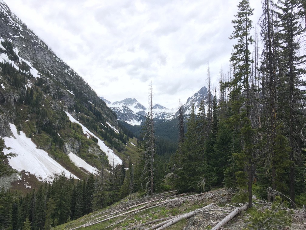 Hiked up to Twisp Pass from the Road's End campground. Some large water bar dips on the road in. The lower portion of trail was burned in 2018 Gilbert/Crescent Mtn fire, but is in pretty good shape. There were perhaps 10-15 trees (or clumps of 2-5 trees) down across the trail on the way up, but only a few required much effort to get under or over. Snow patches started around 5500', but continuous snow didn't start until around 5800'. The trail wasn't too hard to find, with some old footprints that followed it well, only the last turn and final northward climbing traverse to the pass were at all tricky to find. But the sloppy, collapsing, snow at lower elevations definitely slowed us down.