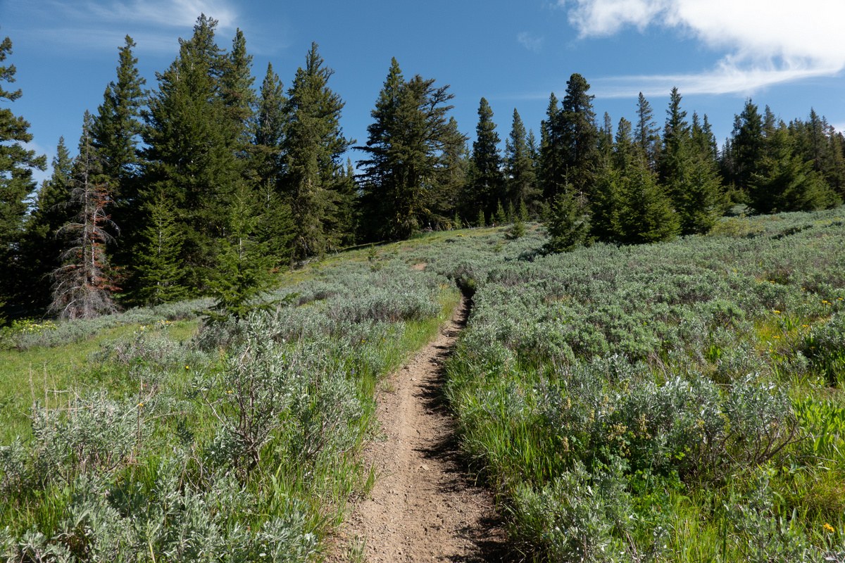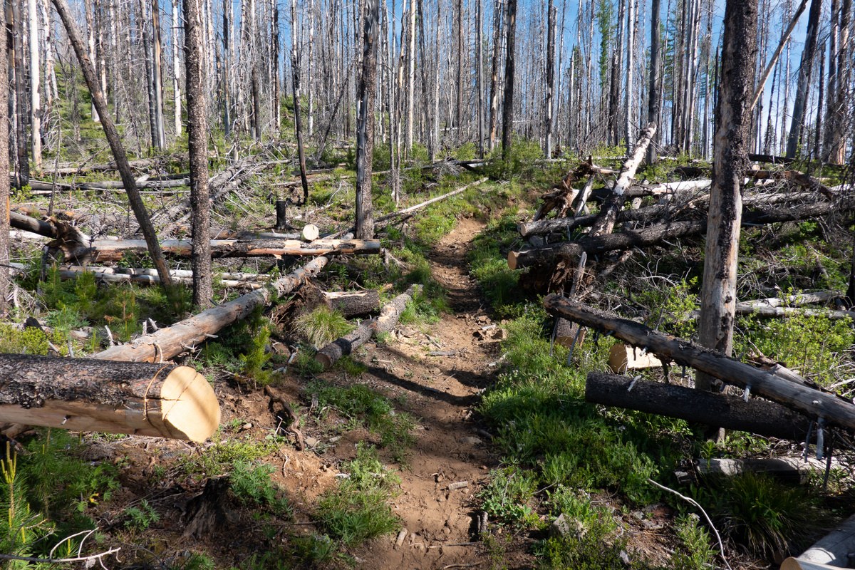 Found the start of the Mt Lillian trail (#119) at the north end of the campground, and followed it all the way to the top. The trail was in great condition, no blowdowns, even in the old burn areas. The only obstacle was a mud pit just before the trail briefly joined Rd 4W312. Avoided this on the way back by staying on the road an additional ¼ mile before connecting back to the trail. The best view was ¼ mile from the top (which is flat, and covered with burnt trees).