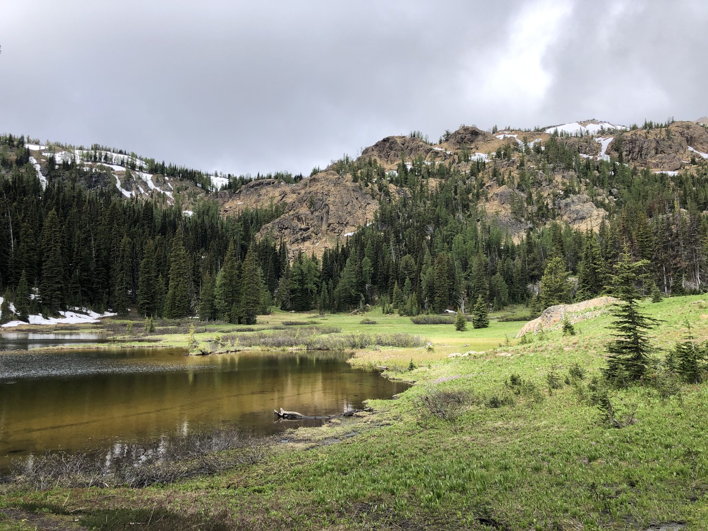Trail is snow-free and sites are completely melted at Caroline. Wildflowers were lovely. Some mosquitos but it was pretty windy- I’m sure they would have been a lot worse without the wind! No noteworthy snow on the trail between Caroline and Little Caroline; backpacker sites and horse camp at Little Caroline were also snow-free and dry (I only saw 2 decent tentsites at Little Caroline; all the sites at big Caroline were great). A few small patches of snow on the way up to Windy Pass, but nothing major; I was fine without microspikes (but did appreciate my poles). The trail was pretty soggy/running water in places in the basin below the pass, so I was glad to have worn my waterproof boots instead of the trail runners I normally hike in.