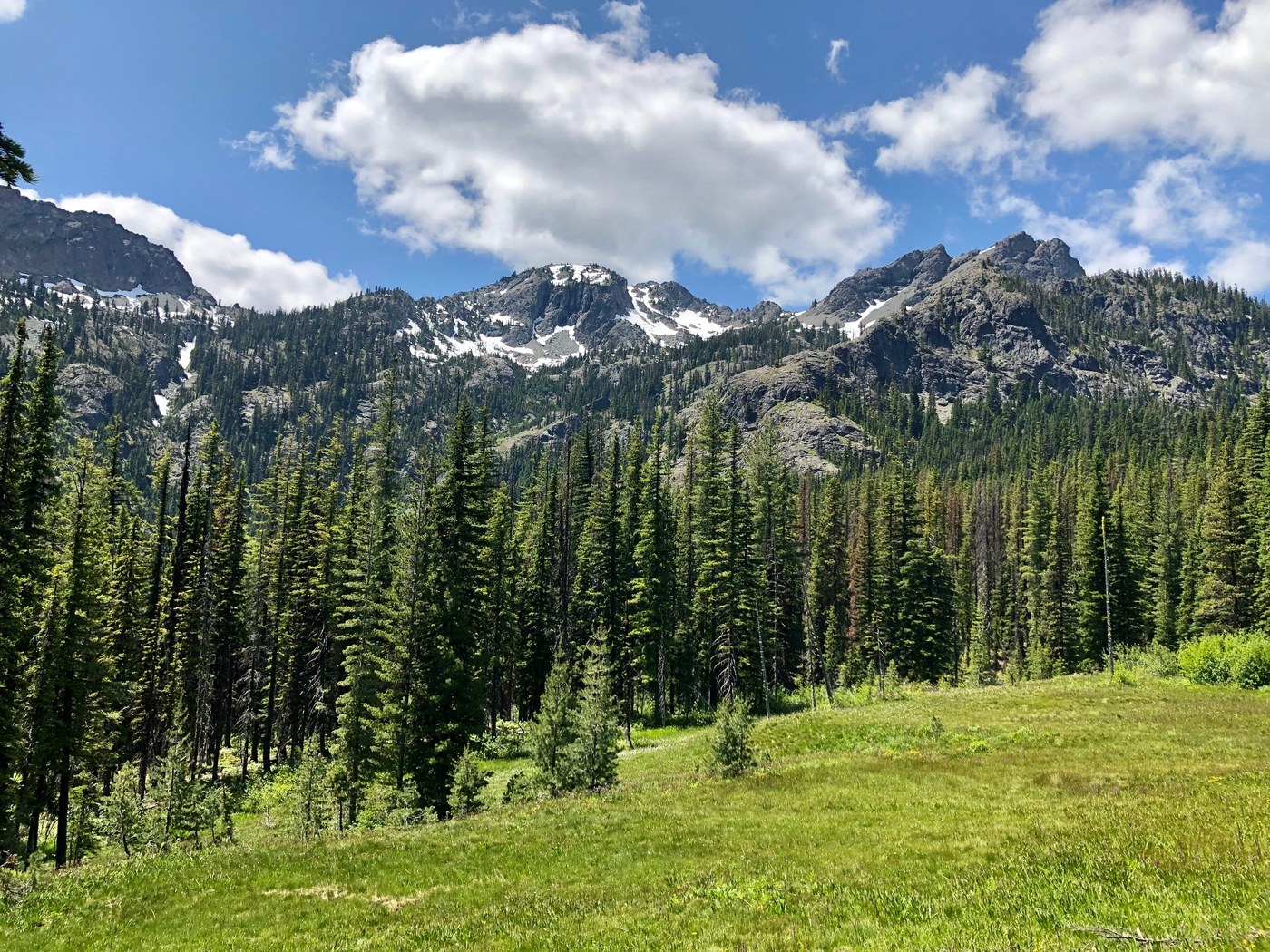 Absolutely perfect time to hike Esmeralda Basin: There is enough snow hanging on the east flanks of the Esmeralda Peaks on the opposite side of the valley to provide dramatic alpine views, but no snow at all that you need to hike through; water is flowing in the creeks and streams that feed into the North Fork of the Teanaway River providing a pleasant sound track as you work your way up the basin; there are numerous creek crossings, but none are difficult; the meadows are lush and green; both wildflowers and bird song abound. Perhaps best of all in our age of social distancing, fellow hikers were few and far between even on a sunny Sunday of a holiday weekend.