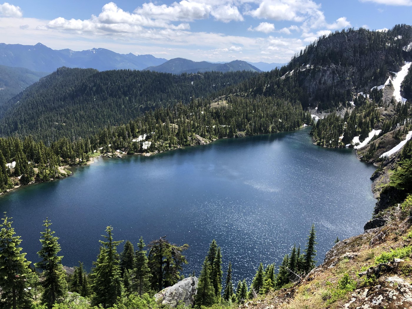 I started my solo hike much later than I wanted to, around 12noon. The Rachel Lake trailhead lot was full but there are plenty of spots to park down the road. I did not encounter a huge number of hikers on trail, and the hike was super easy for the first couple of miles. After that, the last mile up to Rachel Lake was fairly strenuous for two reasons: elevation gain and basically hiking off and on through a creek. Rock hopping and/or stepping in a bit of water is necessary. I enjoyed that about this hike, especially the many very accessible waterfalls that I passed. No need to carry a lot of water if you're carrying a filter. I started seeing a few snowfields as I neared Rachel Lake, and the Lake was beautiful, a truly great destination for camping.
