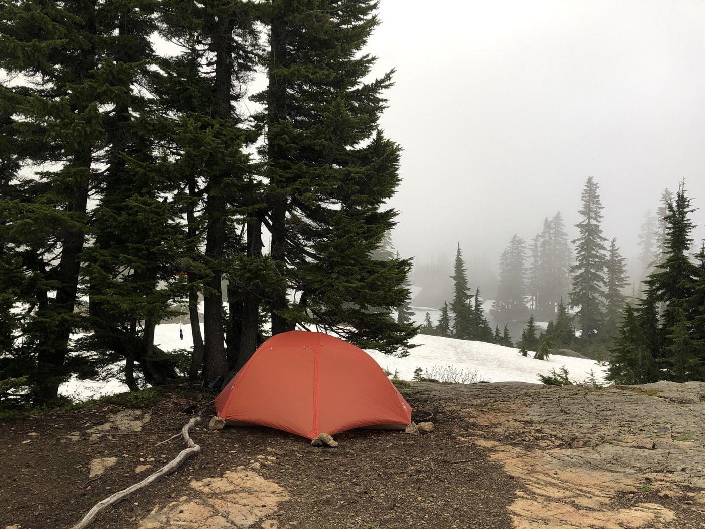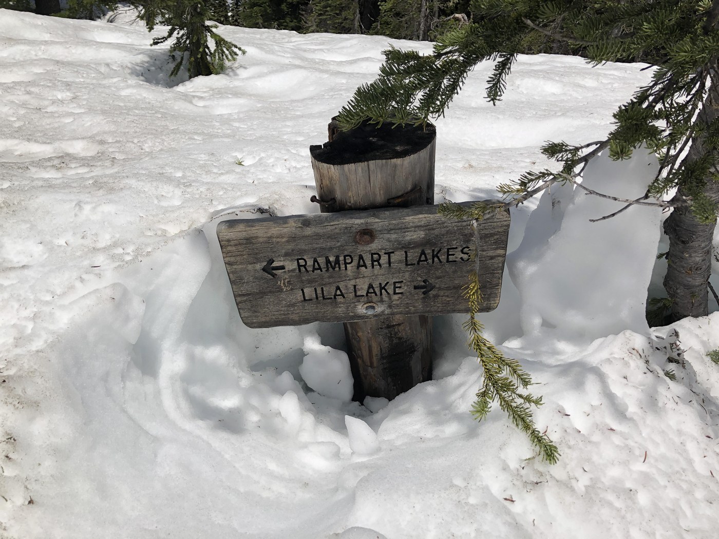 From here to Rampart Lakes I hiked across mostly hard packed snow fields (no extra traction necessary), following footprints and Gaia maps until I reached the first lake and a camper. I continued on until the very end of Rampart Lakes where I found a nice camping spot on a rock next to a tree. There were a handful of campers there.