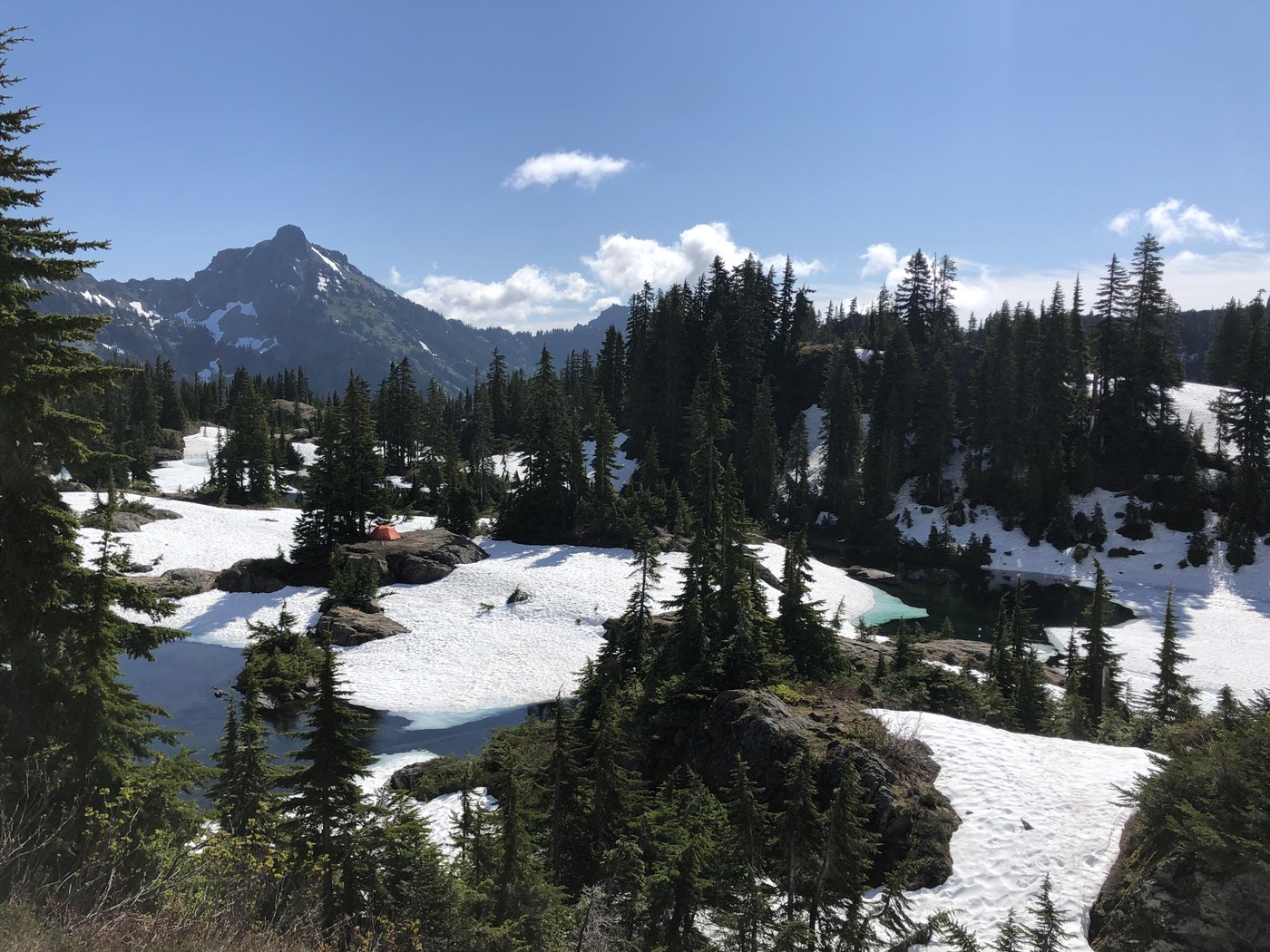 However, there were a number of campers, so based on the report of a couple hikers I passed I decided to press on to Rampart Lakes for a little more privacy. Immediately, I made my way across a snowfield to the switchbacks that take you up the ridge and above Rachel Lake. If you stay at the Lake, you really should head up this ridge just for the views of Rachel Lake from above.
