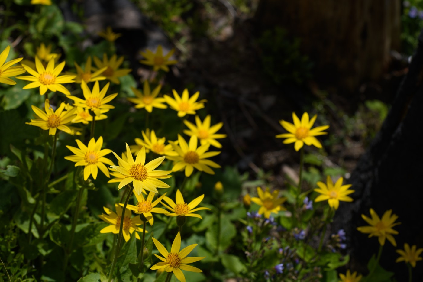 For first timers like me on this trail, it can be a sensory overdose. The stark remains of forest fire, right after 2miles into the trail, amid blooming wildflowers is a a surreal experience. The trees shine silver and black in sunlight while the understory, now fully exposed to sun, is riots of colors - starting out with bear grass at lower elevation, giving way to lupines and occasional paintbrush and arnica as we climb higher. Closer to ridge, it a yellow carpet of glacier lilies. On reaching the ridge, the eastern views gives another sensory jolt. Vast open meadows are spread out with far-off peaks undulating into the horizon.
