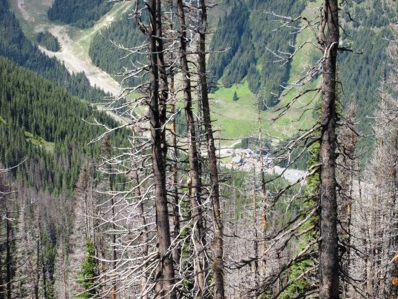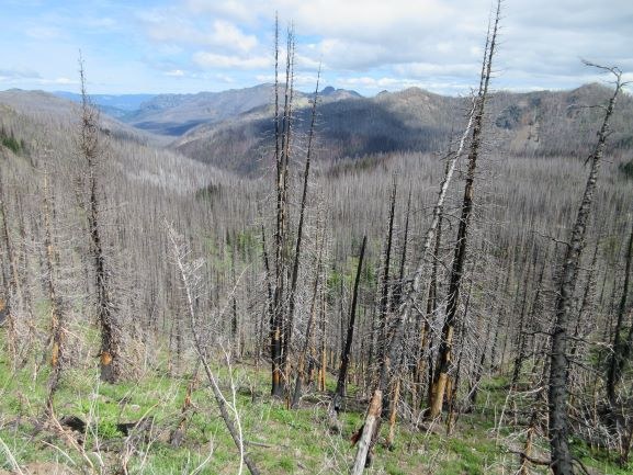 I was amazed to see how close the fire got to the resort, one photo of that, very close! Also amazed to see a few green survivalist tree among the sea of burn. I took the PCT up to Basin Lake and then looped back on #987 to get back to the PCT. A few steep snow field on 987 but they are melting out fast.
