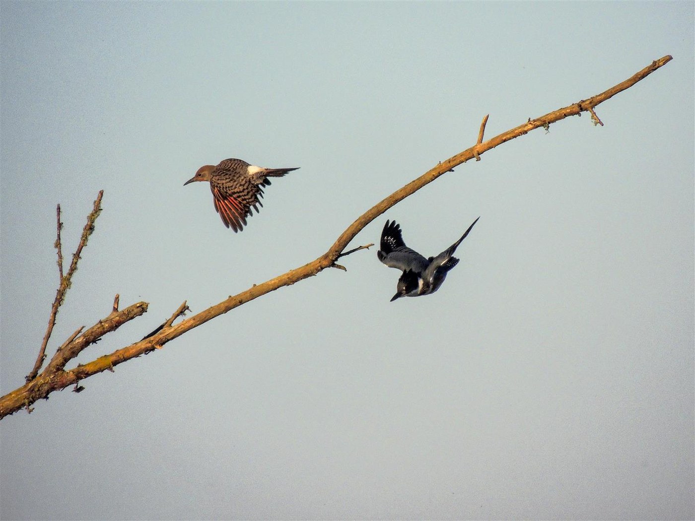 The birds were active early. I saw Kingfishers, Herons, Eagles, Hawks, young Doves, ducks, shore birds, and more. Two adult and two fledgling eagles flew to their nest at the same time. The fledglings are about ready to leave home.