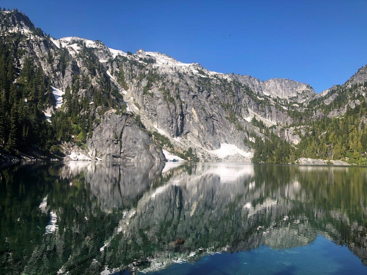 We headed to the mountains to escape a hot weekend in Leavenworth! Hiking up the French Creek trail is easy and shady. The first 1.5 miles along Icicle Creek are flat and a perfect introduction to back country camping for young families with open flat sites next to a wide water fall. French Creek trail immediately above the junction is FULL of ripe huckleberries. YUM! Trail up to Klonaqua lakes is STEEP, but once you get there the views are glorious. We camped at the dam on Lower Klonaqua with a strong breeze to keep the mosquitoes at bay, otherwise they would have been difficult. Upper Klonaqua had several groups stay Friday with more coming in Saturday. We headed up Snowall Creek with 2 easy creek fords. I didn't get my shorts wet, so maybe 2.5 feet deep across French creek and less than knee deep across Snowall creek. Gorgeous meadows FULL of flowers in prime bloom in the upper half of Snowall valley with increasing views of rugged mountain tops opening up. Stay left and look for cairns when the plants take over the trail going up and you'll recover it along the edge of the woods. There were a couple patches of snow at the pass, but it's off trail and melting quickly. The lake was warm enough to actually swim a bit before going numb. We appreciated the cool after our 3000' climb in hot sun. We camped back up at the pass above Cradle lake hoping for breeze to keep the bugs at bay again, but no luck that night so it was early to bed for us. We wanted to take Bootjack Mountain trail #1565 back to the trail head. It is mentioned in guide books as difficult to find, but we're well experienced and still lost the trail after crossing Pablo Creek. We climbed the old burn (STUNNING flowers!) to the ridge end where USGS, Green Trails and Gaia all agreed we were on trail, but there was no trail to be found there nor anywhere looking into the Ben Creek drainage. After 2 hours of searching we headed back to take Meadow Creek trail #1559 and Jack Creek trail #1558 down the the trail head. Both of these trails are nicely shaded in the woods, but lacking views and very churned up by horse traffic with 4-6 inches of dust where it's dry and up to 1 foot! deep mud at creek crossings with horses leaving post holes up to 3 feet deep in places. We encountered 2 groups with a total of 15 horses each out for an over night - meaning the equivalent of 30 horses passing through in 36 hour span. One of these groups was taking a couple glamping at Cradle lake with 5 mounted horses and 4 loaded pack mules. No horse camping at Cradle lake means this train has to go up and back twice so 2 people can be deposited at the lake for a night. Granted the Backcountry Horsemen have cleared all the downed trees, but the heavy traffic has thrashed the tread. Meadow Creek trail has 2 fords that are less than knee deep before making Jack Creek trail. I just may have sat down mid ford for an extended cool washing of trail dust and mud... ;)