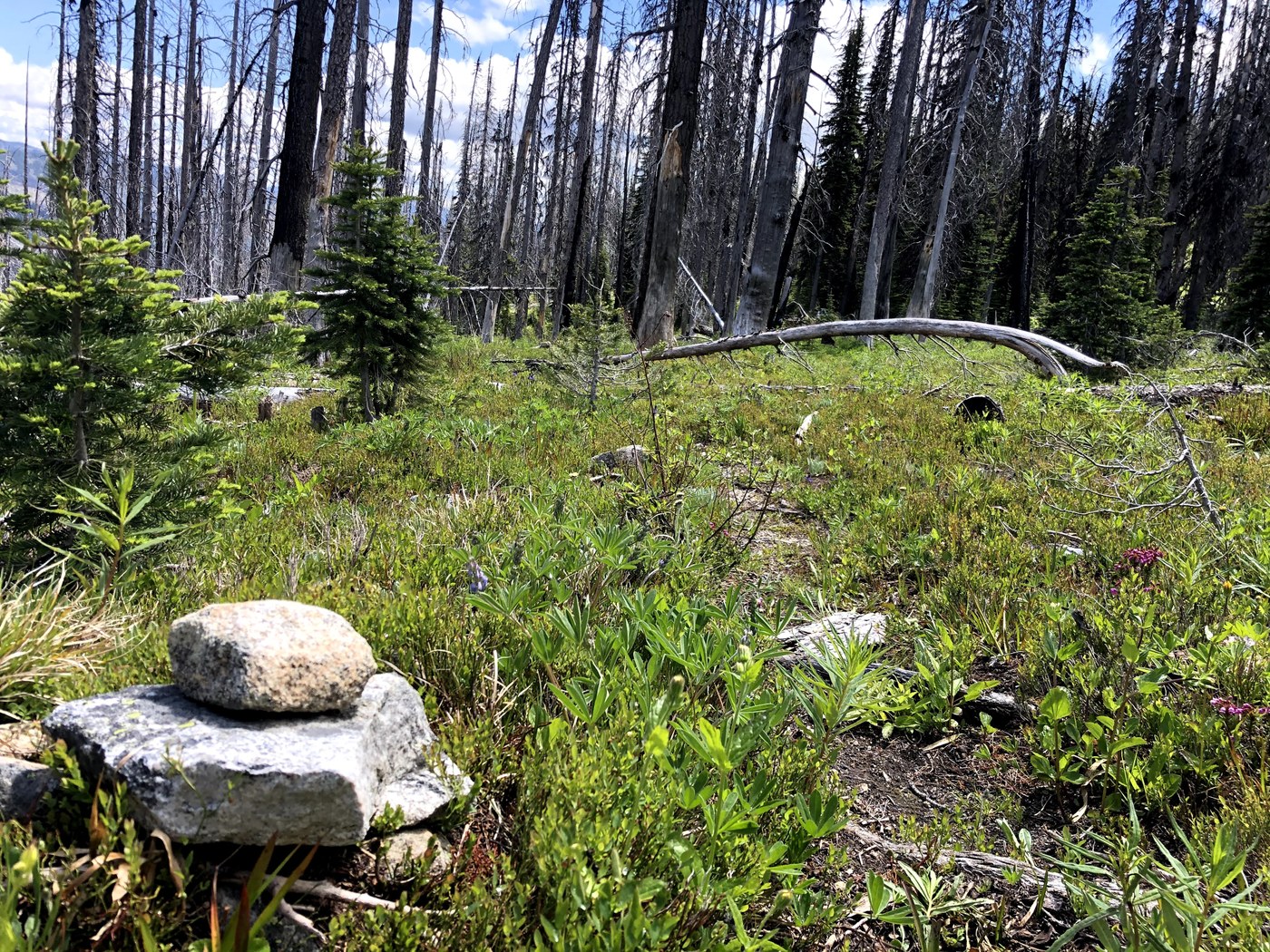 The route from Airview down to Andrews Creek has many trees but is short and straightforward. From Andrews (at Airview junction) up to Peepsight mountain (past Rock lake, Crazy man pass), there were nice cairns to follow through the burned forest. Many trees down, but mostly straightforward. Follow the cairns and if you can’t find them, double back and look again. The trail has been maintained in the past, but lots of blowdown of dead trees have accumulated. This stretch is in better condition than the next.