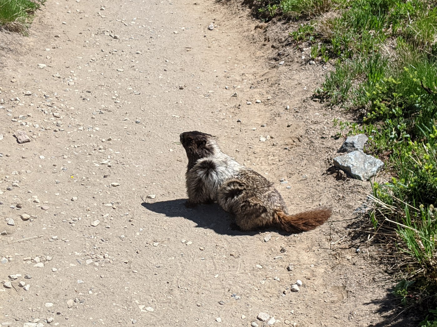 Plenty of critters out today. Spotted marmots, chipmunks, and birds all day long, and in the last mile of the Shadow Lake loop I encountered a black bear only 15 or 20 feet off the trail. It didn't even bother looking up though- just walked right off into a thicket and out of sight.