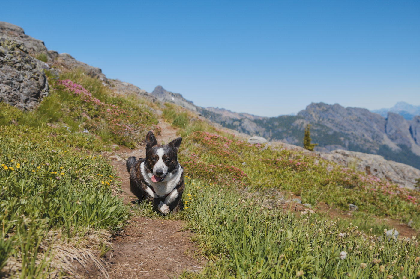 Overall, the trail(s) were in good condition. A tiny bit overgrown below the climb to Rachel, a couple steep and rocky areas (particularly descending to Lillian) where I was reduced to scrambling a bit (the dog, however, with his low center of gravity, has a strong advantage on this terrain), and one larger remaining snow field climbing up the ridge past Rampart Lakes, which is a bit soft later in the day but kick-steppable without special gear.