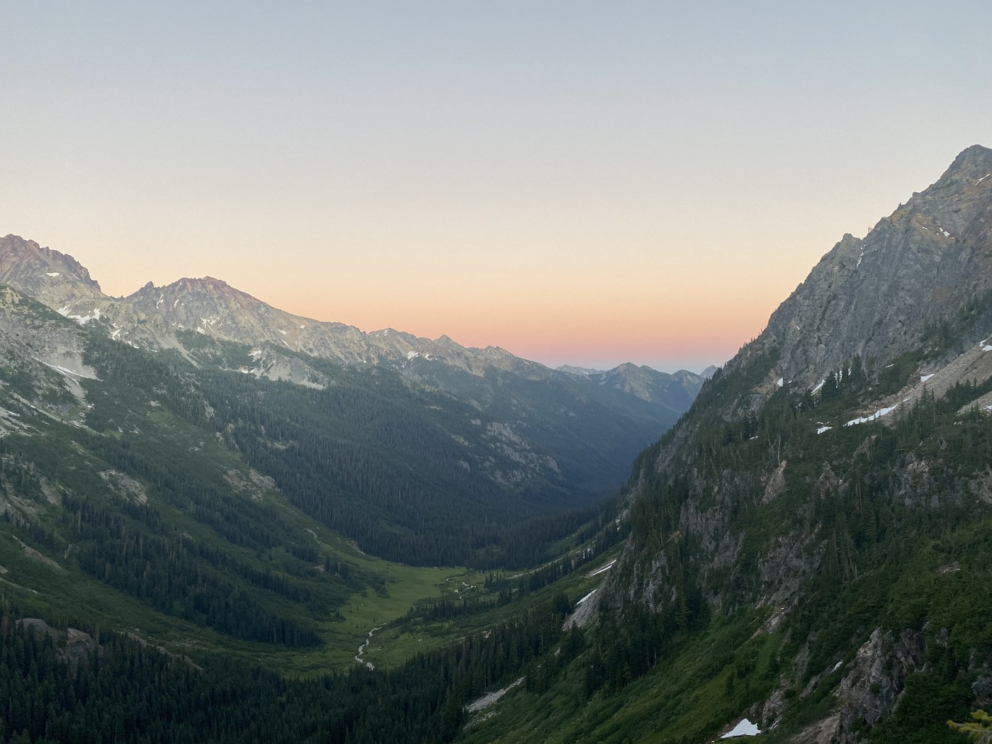 During the day, the wind comes up the valley, towards the North. As soon as the sun sets, the wind direction flips and blows down over the gap and snowfield and stays like that the whole night. This, coupled with being at 6200' elevation, made for a colder than expected night. I planned for the elev, but not for the wind being chilled on the snowfield. I brought my 15 F bag, and slept in thin wool and was fine, didn't wear a hat either. However, if I had brought a 40 F bag, I probably would have been cold. I had direct sunlight on my spot until 6 pm, at which point the sun went behind the mountains. The sunset colors down the valley were gorgeous. The night sky was amazing, I could see the splotchy dark blue band of the Milky Way. I looked closely for the NEOWISE comet, but couldn't see it (thinking it was behind the mountains). The person I talked to who had come up from over the gap said they looked for it from Lyman Lake but couldn't see it either, so it must just not have been visible without a telescope or astrophotography gear.
