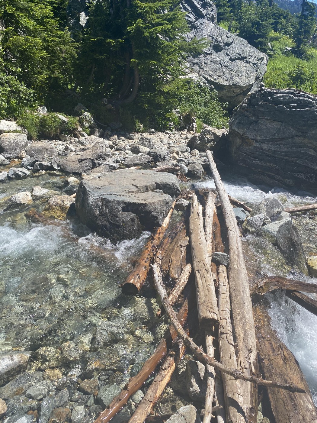 The trail up to the meadows, for the most part, is very well graded. It is a very high use-trail, and it shows in the well worn footpath. Yet, surprisingly, there are a number of very overgrown areas. Not a big issue, just make sure to do a tick check after your hike. I know we don't have many on this coast, especially in WA, but that is changing fast unfortunately. This time of year, many of the seasonal streams are dry, and the river crossings are pretty easy. I was able to make it all the way up to Larch Knob without getting my feet wet. The trail at Leroy Creek becomes a bit difficult to navigate just because so many foot paths branch out there where people in, presumably May and June, have looked for the best location to cross when the level was higher. The creek splits in three here so it is quite wide, but shallow. The far bank looks like all vegetation so for a minute you might wonder where the trail goes. Any crossing option works great now, and just head to the left, down river, to pick the trail back up. The highest-stakes crossing is crossing Phelps Creek at the head of the meadows (pic attached). Easy to cross without getting wet, but if you slip, the water will go up over your boots. Fortunately, those logs are very secure (at least at the time of this writing).