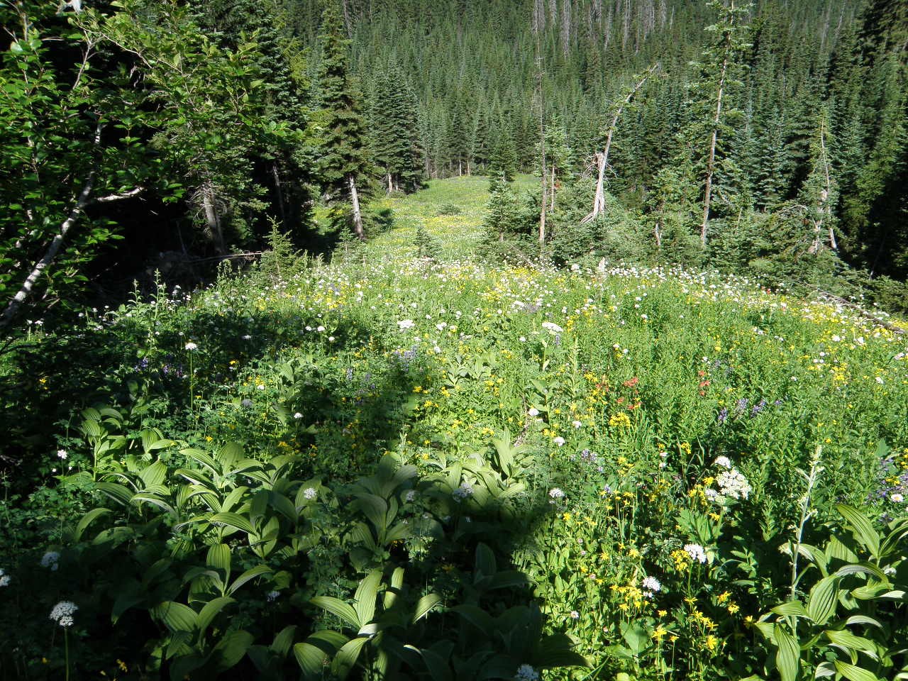 This morning on the way down I clipped out to the water, and below. Trail is not perfect but a heck of a lot better than it was just a week ago. Look for flags where path is still overgrown, indistinct meadow crossings are marked on either side. 2nd and 3rd crossings of East Creek are no longer confusing, just be sure and pay attention on the way in.