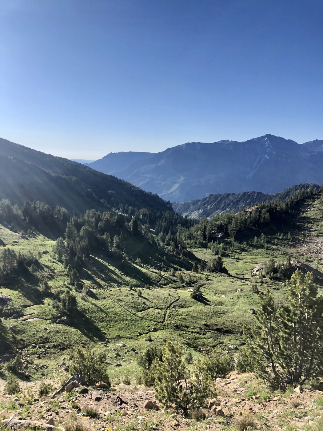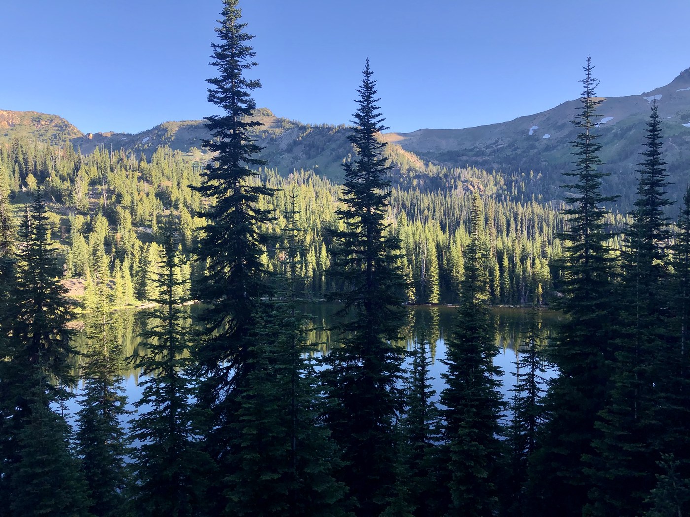 The trail to Lake Caroline spurs north near Little Eightmile Lake and ascends through many downed and burned trees. Indian Paintbrush is in full bloom and the early morning dawn was a perfect temperature to combat the first of four big climbs of the day. Right before the descent to Lake Caroline, the trail enters a much more vegetative area; tree canopies made it a bit darker to see than the previous exposed section.