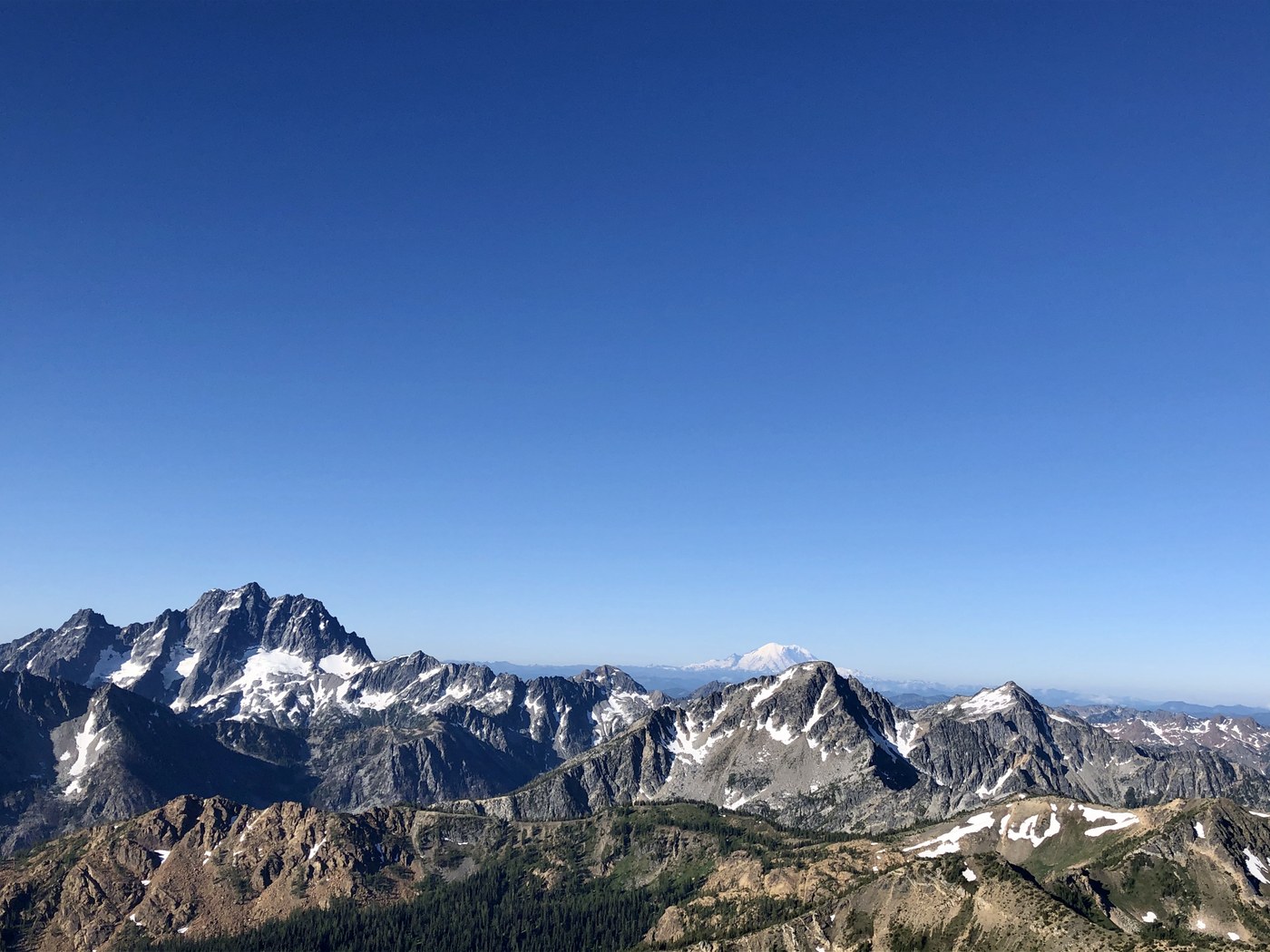 At the top of Windy Pass, nicknamed for a reason, most of the major volcanoes are visible: Rainier to the south, peeking between Mt. Stuart and Eightmile Mountain; Glacier Peak to the north; and Mt. Baker to the northwest. Mt. Adams and Mt. St. Helens not visible from my vantage point.