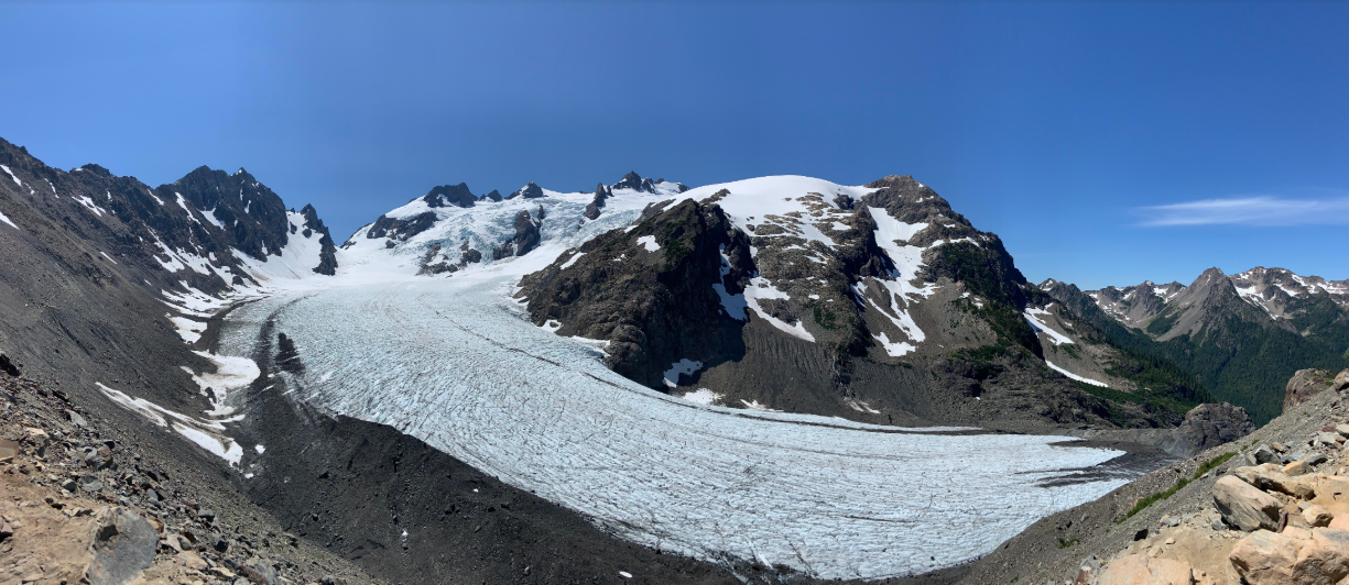 The second day two of us woke up early and hit the trail at 6am to head up to Mt. Olympus and Blue Glacier, an 18 mile round trip day hike. For the first 4 miles from Olympus Guard Station, the trail continues along the Hoh River and stays flat. Moderate elevation gain begins after that, but nothing too crazy until you reach Elk Lake. Note: Elk Lake is not a pristine alpine lake if that's what you were envisioning. It's beautiful, but it's marshy and buggy (and looks like a place a herd of elk would enjoy!). After Elk Lake, the trail kicks up a notch and meanders upwards until you start to get some long awaited views of the mountain through the trees. Before you reach Glacier Meadows, there is a big slide area that you navigate via avalanche ladder - definitely the most sketchy part of this hike. There is a rope next to the ladder so you can also just rappel straight down the slide. Another note: there is no view of the mountain or glacier from the sites at Glacier Meadows. By this point we were pretty wiped, but we pressed on the additional 1.2 miles to see Blue Glacier. We choose to hike up to the lateral moraine (vs. terminal moraine), figuring we'd get a better view from up alongside it. We guessed right - the view is killer. The last portion up to the viewpoint was the hardest part. You pick your way up through a glacial meadow (filled with wildflowers still!) and a scree canyon with the occasional snow patch. The trail is marked by rock cairns so keep your eyes peeled for those. We had lunch with our glorious view of the glacier (which we had all to ourselves on a Monday afternoon!) and headed back to camp after some obligatory pics. Got back to Olympus Guard Station around 6pm so 12 hours round trip. Passed lots of Olympus bound climbers on our way back!