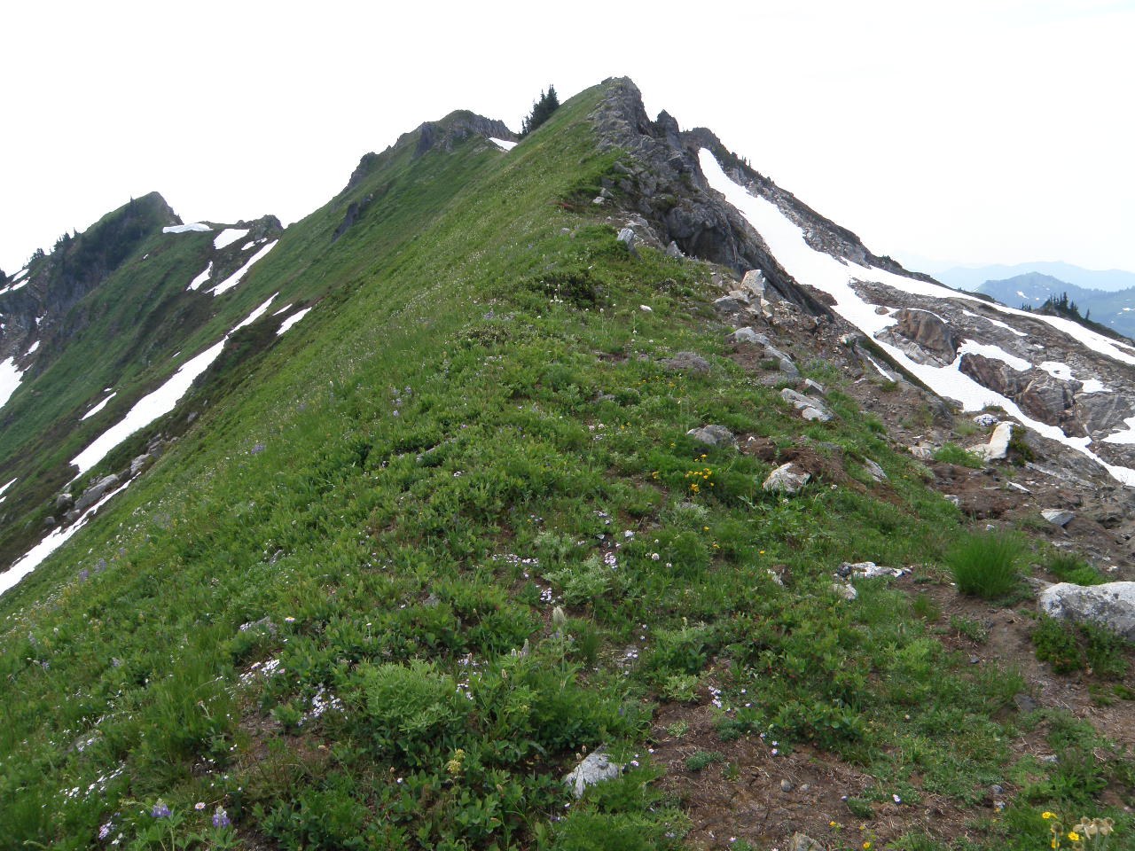 Path soon breaks out of the trees, to an amazing flower show. After a long traverse trail is lost in knee-high flowers. I found a path that angled up, not too much side-hilling. I crossed a few soft enough snow fields, some rock.