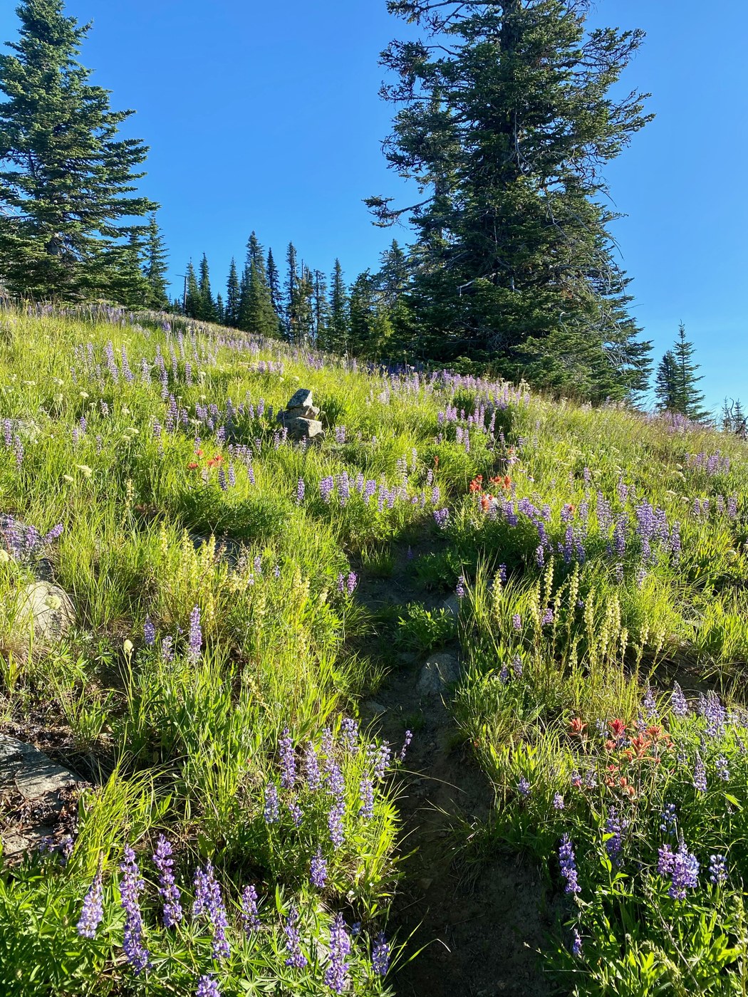 - I heard from some hikers that the snow melted out along the Kettle Crest only in early July. That late melt may account for the spectacular wildflowers I saw all along the hike.