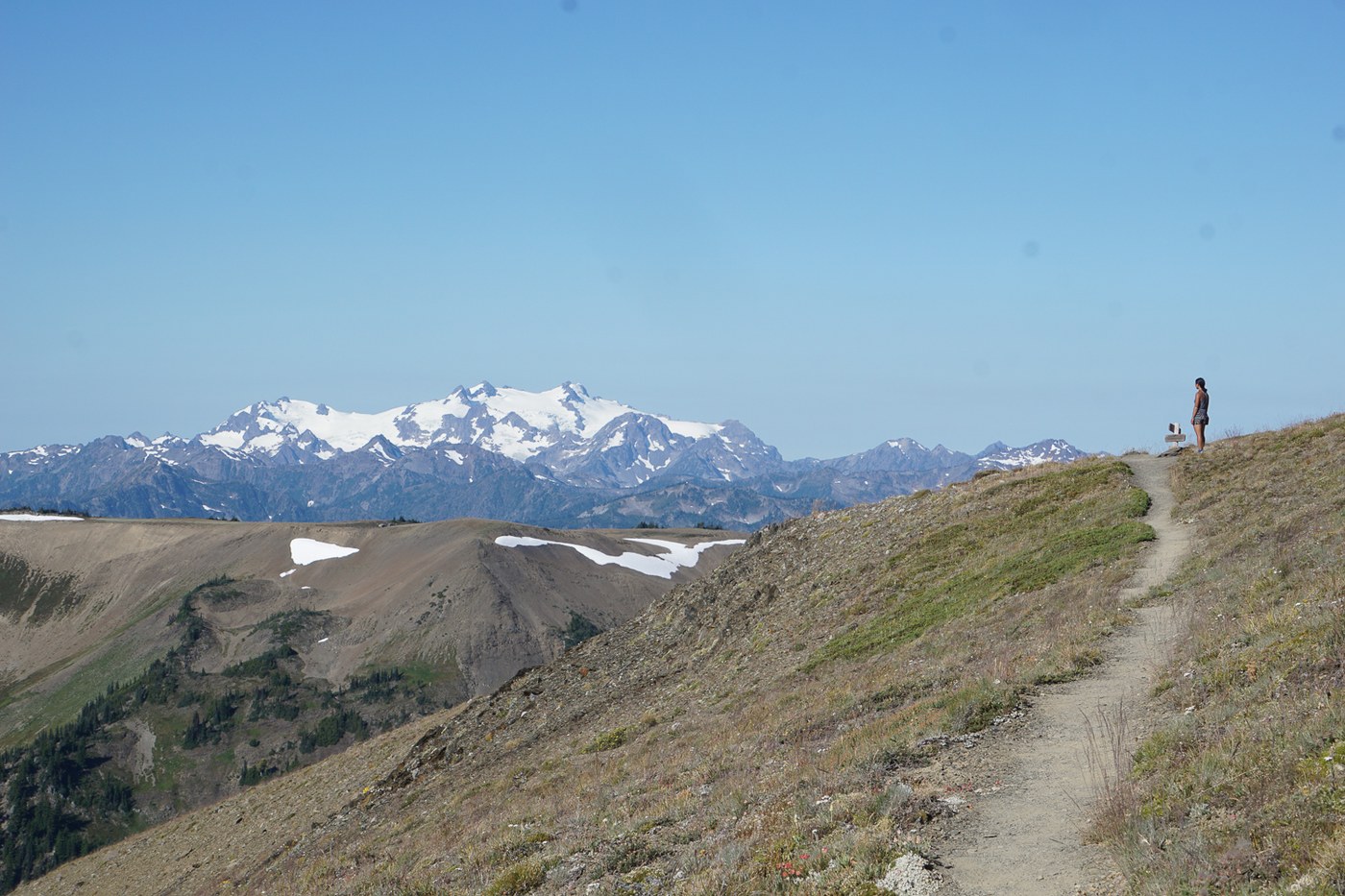 Continuous beautiful views on ridge after leaving the forest. Mostly grassy meadows by now. Most wildflowers are gone. Pretty windy, which was nice since we were there on the hottest day of the year so far.