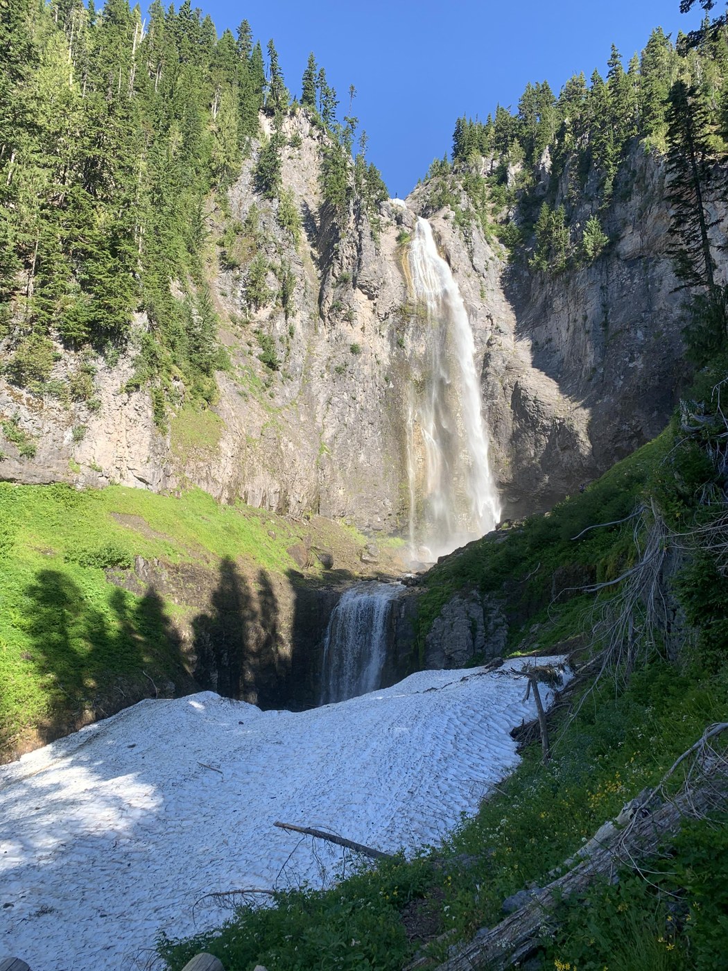 Beautiful little stroll today! We left the trailhead at 9am (it was full by this point, just a few roadside spots available) on this beautiful Monday morning. We had a nice walk up to Comet Falls (we kept thinking we were "there" at the several other small falls along the way, but keep going, Comet Falls is massive!), then continued on to Van Trump Park, walking until we hit the end of the maintained trail. Then we backtracked and headed a little ways towards Mildred Point, just to where the trail crosses over the stream. We scrambled the rocks to the smaller falls at this junction, then headed back to the parking area, stopping for a couple swims along the way.