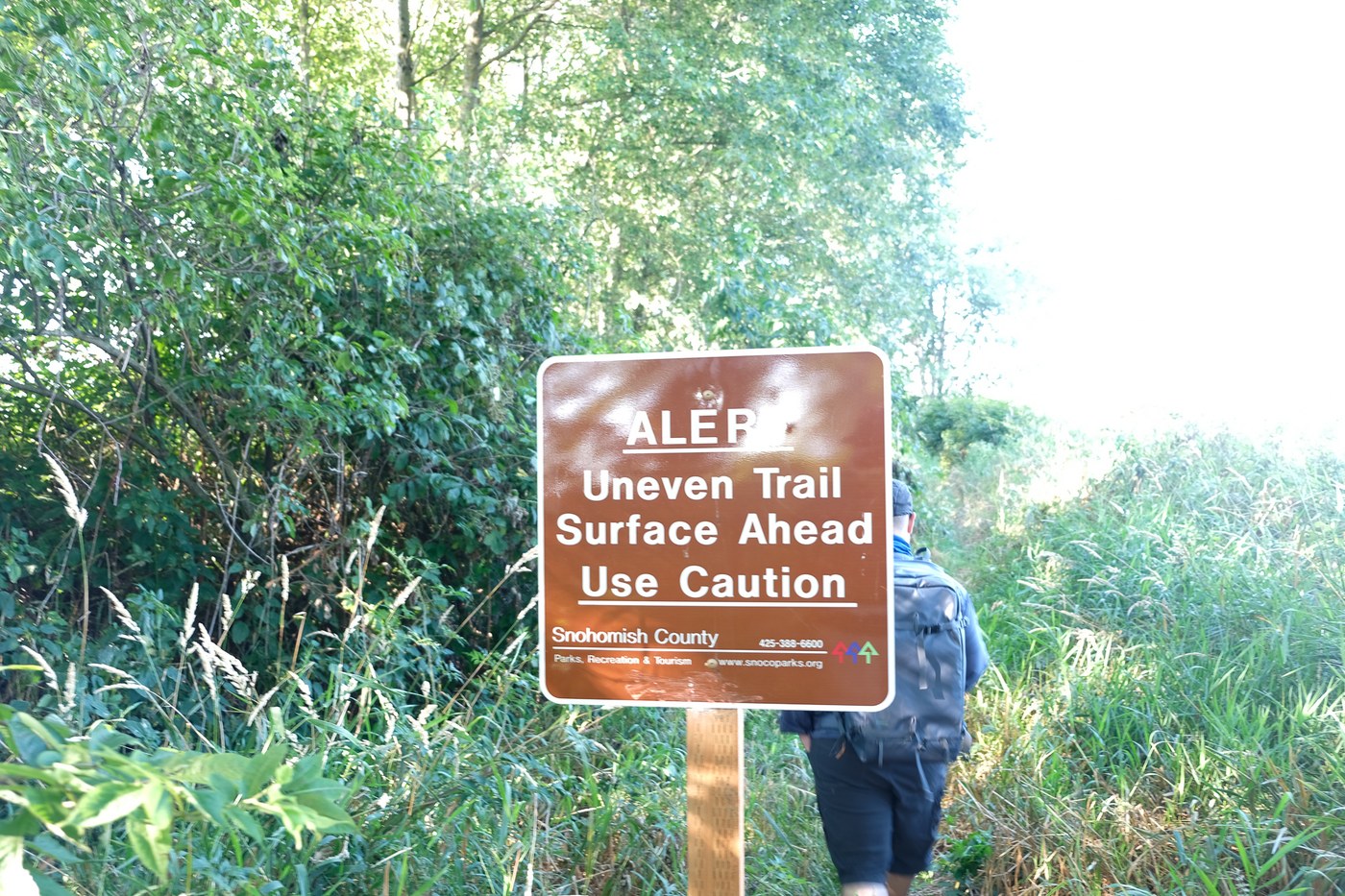 The walk around the Southern portion of Spencer Island, however, was a bit of a mess. Trails don't seem to be getting much maintenance. Across the bridge we immediately turned to the south and then to the west on the cross-island bit of trail. These portions were, for the most part, decent enough. Once you get to the east side of the island, the trail gets a sign about unevenness (not really a huge issue. It's just not graveled, really) but the real issue is that its getting over-grown. From the turn south on the east side all the way around the southern tip of the island is passable but a bit of a mess. Grass was frequently to the knee or higher; blackberry encroached on the trail multiple times. Trail width was frequently not great as well.