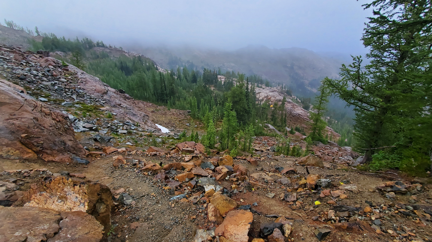 We arrived on Friday afternoon around 2:30pm for an overnight, the parking was full with few cars overflowing by the roadside where we parked. Didn't see many other hikers at this time so they probably were here the day much earlier. At Ingalls pass, we took the camp site trail (1390.2) to the right and descended to the basin. We saw signs for camp sites and toilet, and a number of tents already up along the trail, so we kept going hoping to find a spot that has good view of Stuart as seen in other trip reports. By the time we reached the creek, there was no more flat ground for camp spots and we started ascending up to meet the main Ingalls way trail (1390). From there we turned left onto Ingalls way (away from the direction of the lake) and found an open spot that has good Stuart view and the valley. It was a rainy and very windy night even now in summer, so bring warm clothes! Sunrise next day was pretty from our camp spot. Went swimming at the lake next day, it was peaceful and no weekend crowd yet at about 9+ am. We left camp at about noon to head back and met a lot of backpackers coming up, even more than day hikers, I wondered if they were that many camp spots for all of them. We saw one marmot but didn't see any goats, talked to the rangers along the way and they said the summer heat was driving the goats to lower elevation. Back to the car park around 3pm on Sat, cars were parked along roadside for about 1 - 1.5 miles out from the trailhead.