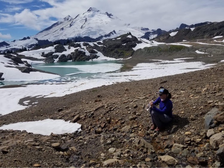 Camping: There are several spots off of Ptarmigan Trail starting at about 2.5 miles, be sure to camp in an established spot and on a hard surface (not on meadow). We checked out a couple spots earlier on, but decided to keep going and check out the spots around goat lakes. The lakes are mostly thawed and a beautiful aqua color. To get to the lakes, at ~ 3.5 miles (before the trail turns right toward Camp Kiser), look to the left and you'll see the aqua/green Goat Lakes. Follow the steep trail down and then follow the rock Cairns toward the lake. Lots of great camping spots in this area. We only saw two other campers in this area and it could accommodate a lot more (but shhh.... the solitude was lovely!). We found a spot on a small ridge on the east side of the lake with views of both Shuksan and Baker. It was a extra steps to go this far, but it was dreamy! If you camp in this area bring a bear canister, there are no nearby trees to hang a bag. We did not see any bears but heard they are in the area and saw some scat that looked like bear. Our neighbors were a group of 14-16 mountain goats, but they kept a distance. There was a lovely stream by camp for water filtering, we also planned on melting snow (or walking to goat lake) for a water source. Bring sunscreen and hats/cover as it's really easy to burn up there! Also plan on packing out any human waste, blue bags were provided at trail head.