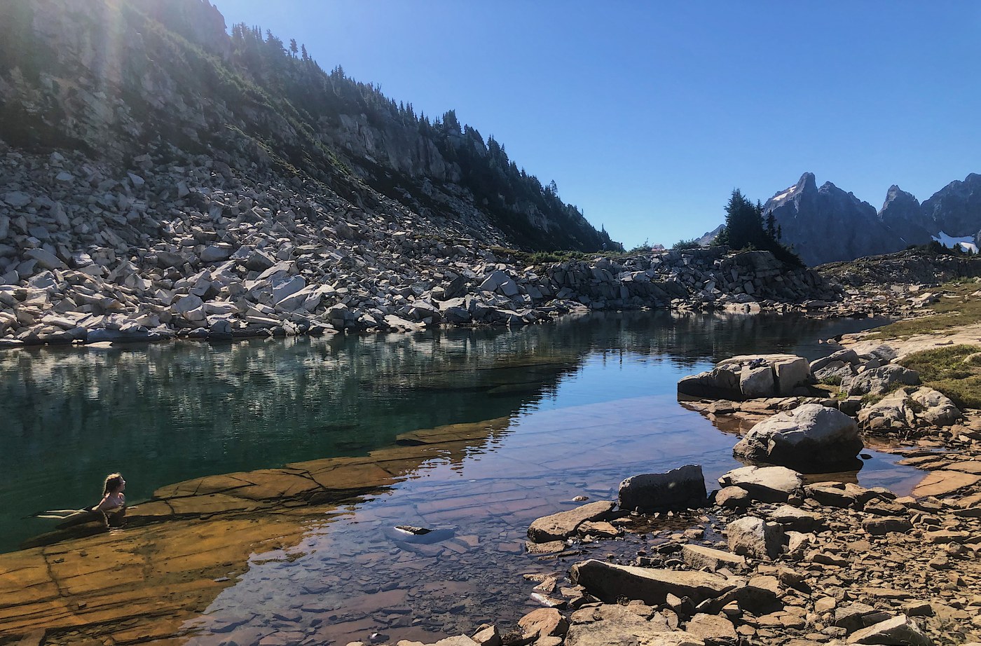 We went swimming Friday morning and saw some people diving in. The lake was quite cold but not unbearable and felt so good on our sore muscles. We headed out to camp at Emerald or Jade lake around 1 PM after enjoying our morning. We ran into quite a few groups (maybe 8 or 10?) coming down. It took us 3 hours and 30 minutes to make it 3.5 miles down to Jade given the boulder situation and not going back the same way we came. The spot at Emerald was taken so we went down to Jade and luckily got the very nice spot on the south side of the lake. There were fresh bear and cougar prints around Jade lake. Two other groups ended up coming in after 8 PM and camped “illegally” right on the water which was upsetting to see but I get that it was late / they needed somewhere to camp for the night safely. Got woken up at 1:45 AM too by two guys yelling on the trail coming in or going out… Definitely a busy trail…