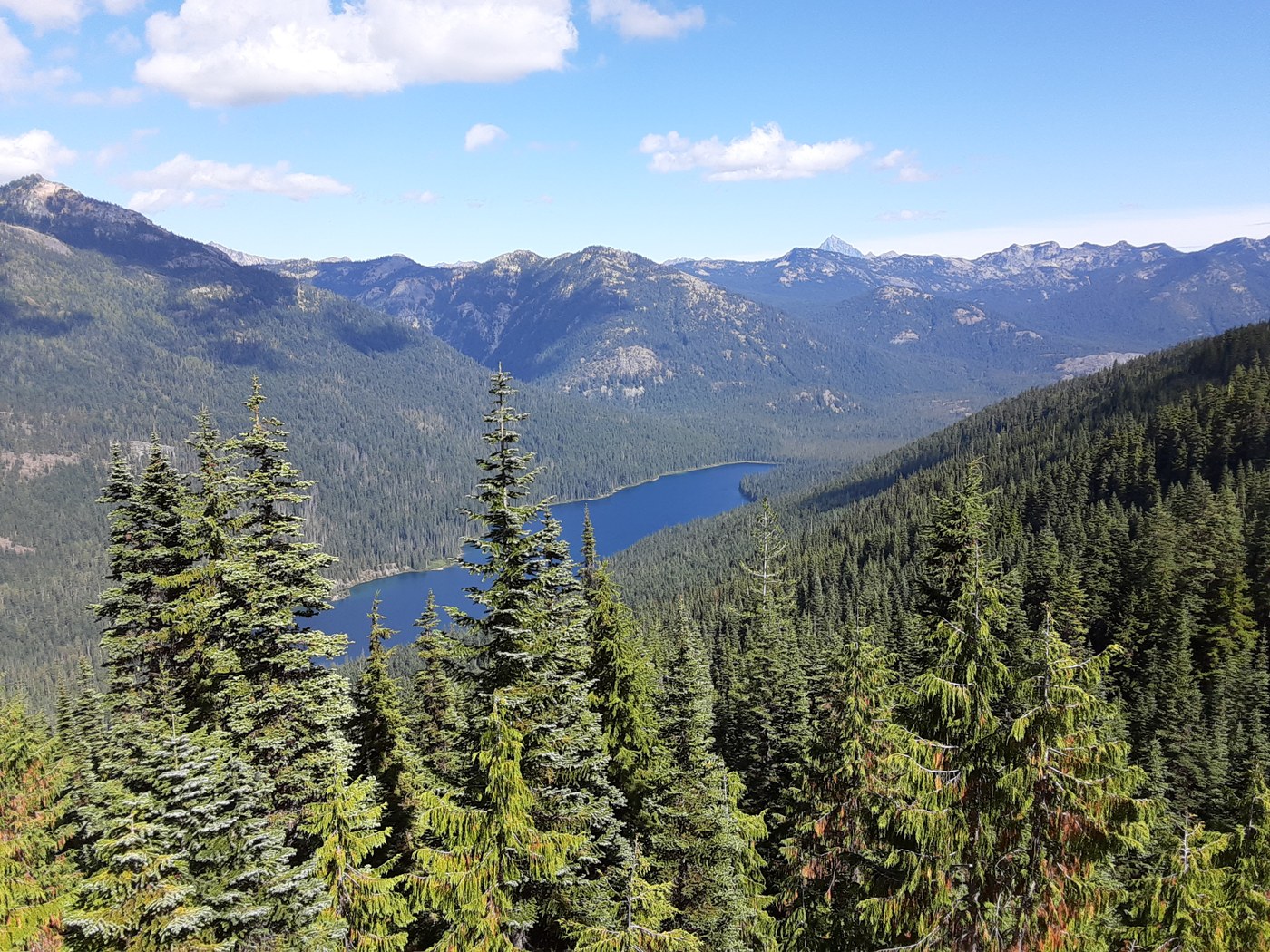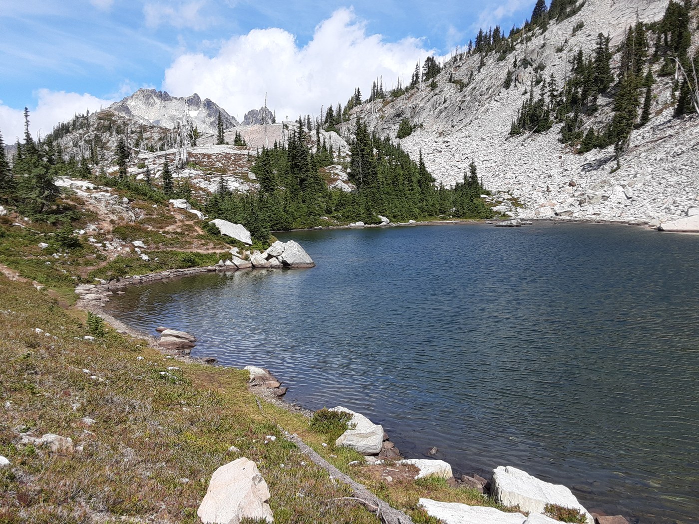 Day 2: Headed up the now-shady Escondido Ridge, which climbs 2500 feet in about 5.5 miles. Fantastic views west to Lemah, The first water is a gorgeous little rock-bound lake with campsites where I refilled my water. I heard from a few hikers that this lake had some biting flies and mosquitoes but not mid-day when I was there. From partway up the ascent all along the ridge I did not encounter any other hikers for 3 hours, a rarity on the PCT and probably partly because there are relatively few through hikers this year. After the first tarn there are huge views of Summit Chief, Little Big Chief, and Lemah. The trail swings around past viewpoints and a couple small ponds (no camping allowed though), then heads to the north side of the ridge and begins the looooong descent to Waptus Lake, partway down just before the start of the Waptus Valley views is a meadow area with little treed knobs for camps, but marginal to no water (there was a trickle across the trail a short bit before). The descent to Waptus seems to take forever though there are some very nice viewpoints. Camped with/near some other hikers at Waptus River, where there is a nice bridge and dramatic views to the surrounding mountains like Bears Breast. Total mileage for the day was 13.